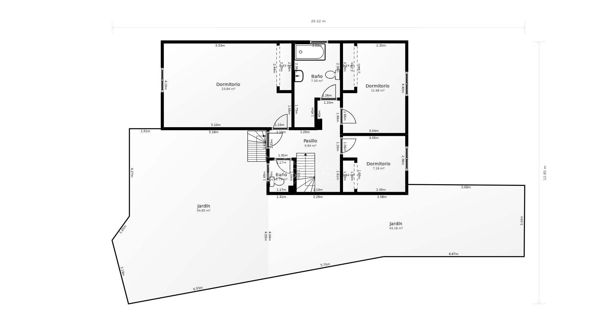 Beim Betreten des Hauses befindet sich rechts ein Gäste-WC und links das Hauptschlafzimmer mit Klimaanlage. Auf derselben Ebene gibt es zudem ein weiteres Doppelschlafzimmer, ein Einzelzimmer sowie ein Badezimmer und einen kleinen Wohnbereich.