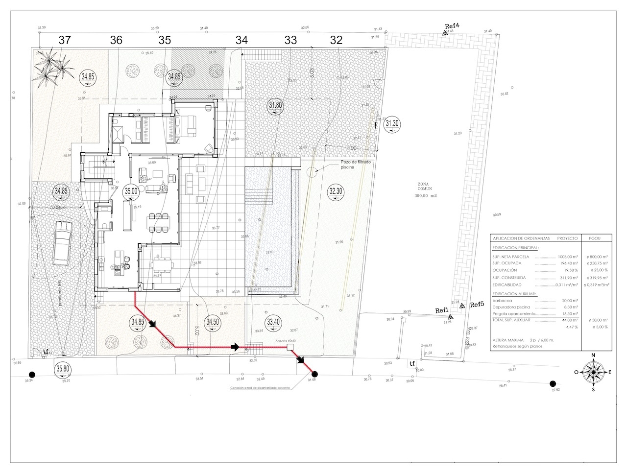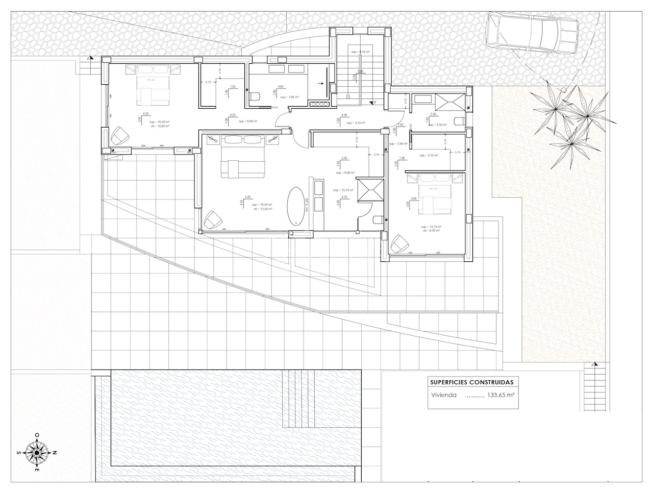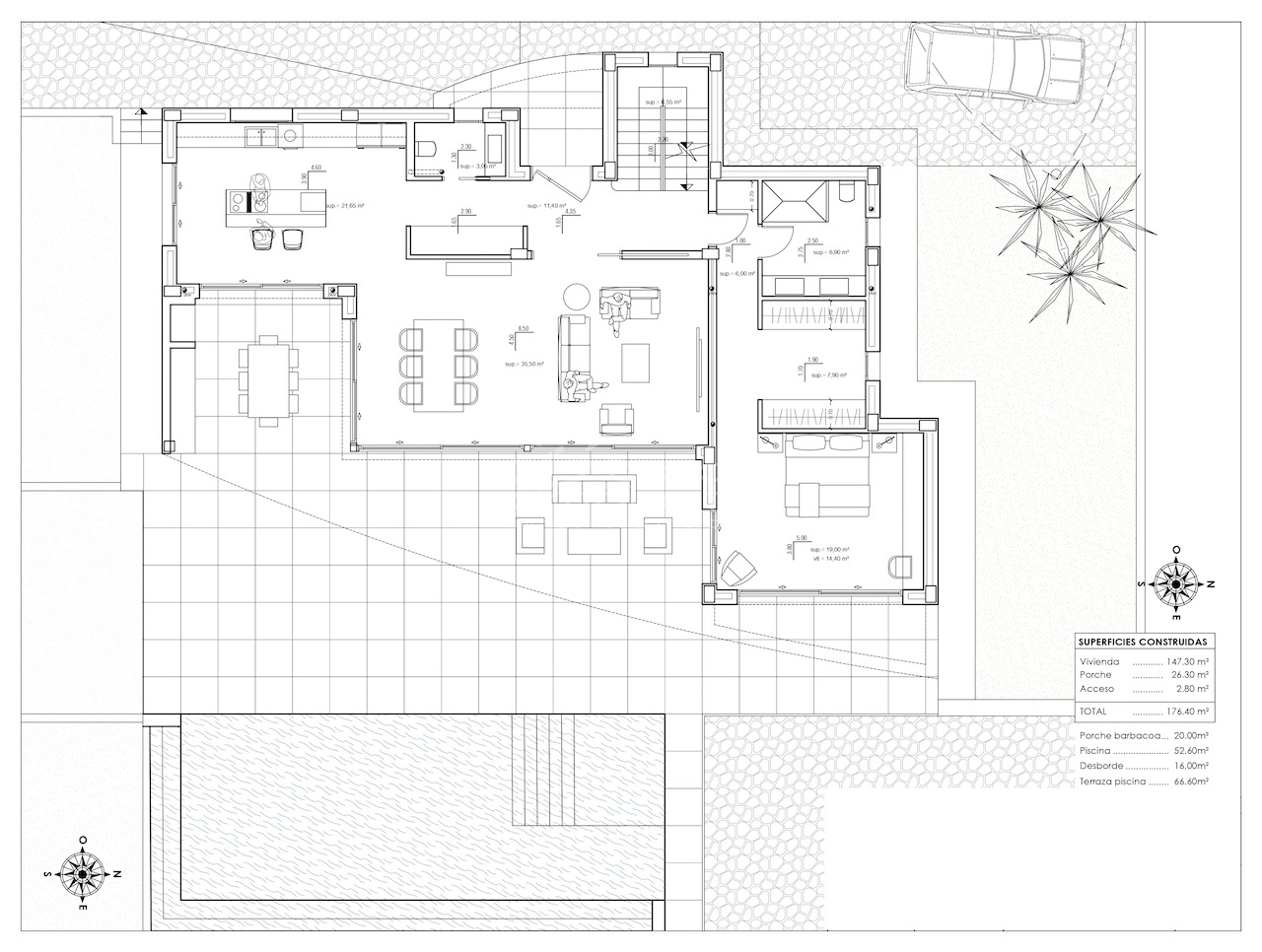 Diese elegante, neu erbaute Villa in La Sabatera bietet modernes mediterranes Wohnen, nur wenige Gehminuten von Annehmlichkeiten und Restaurants und weniger als 20 Minuten zu Fuß vom Zentrum und den Stränden von Moraira entfernt. Das Anwesen befindet sich auf einem 1.003 m² großen, flachen Grundstück mit Meerblick und ausgezeichneter Südostausrichtung. Es erstreckt sich über drei Ebenen mit einer Gesamtfläche von 548 m² und 150 m² teilweise überdachten, teilweise offenen Terrassen, die sich ideal zum Essen und Entspannen im Freien eignen.