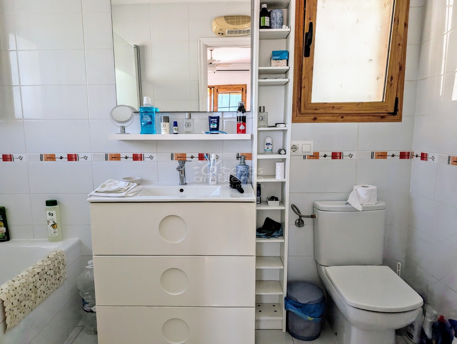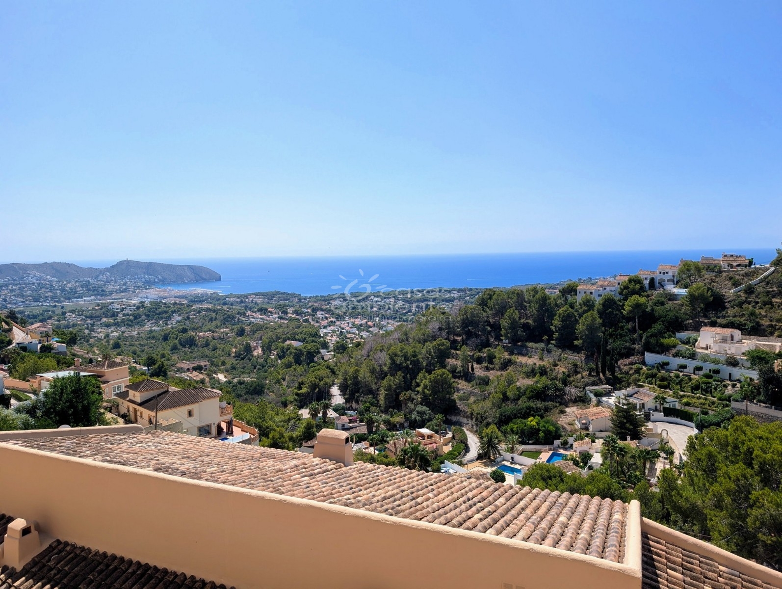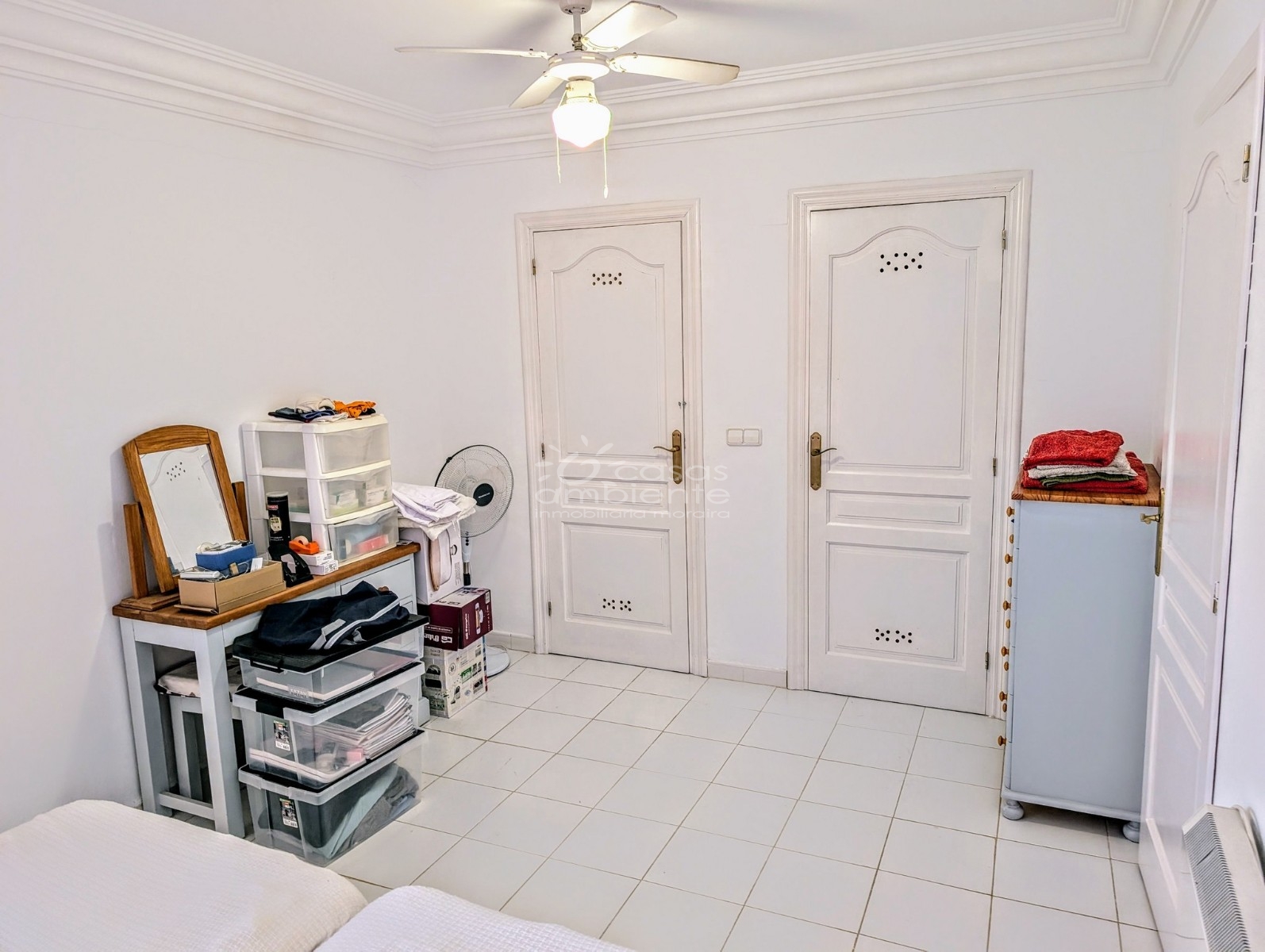Una escalera bien iluminada conduce a la planta inferior, donde hay dos dormitorios dobles con armarios empotrados, un baño con ducha, un armario para ropa blanca y una gran sala polivalente, ideal para niños o como sala de juegos. Desde esta sala se accede a un pasillo con lavadero, otro baño con ducha y un amplio dormitorio con dos vestidores. La terraza inferior, de unos 96 m², incluye una naya abierta con impresionantes vistas a Moraira y al mar.