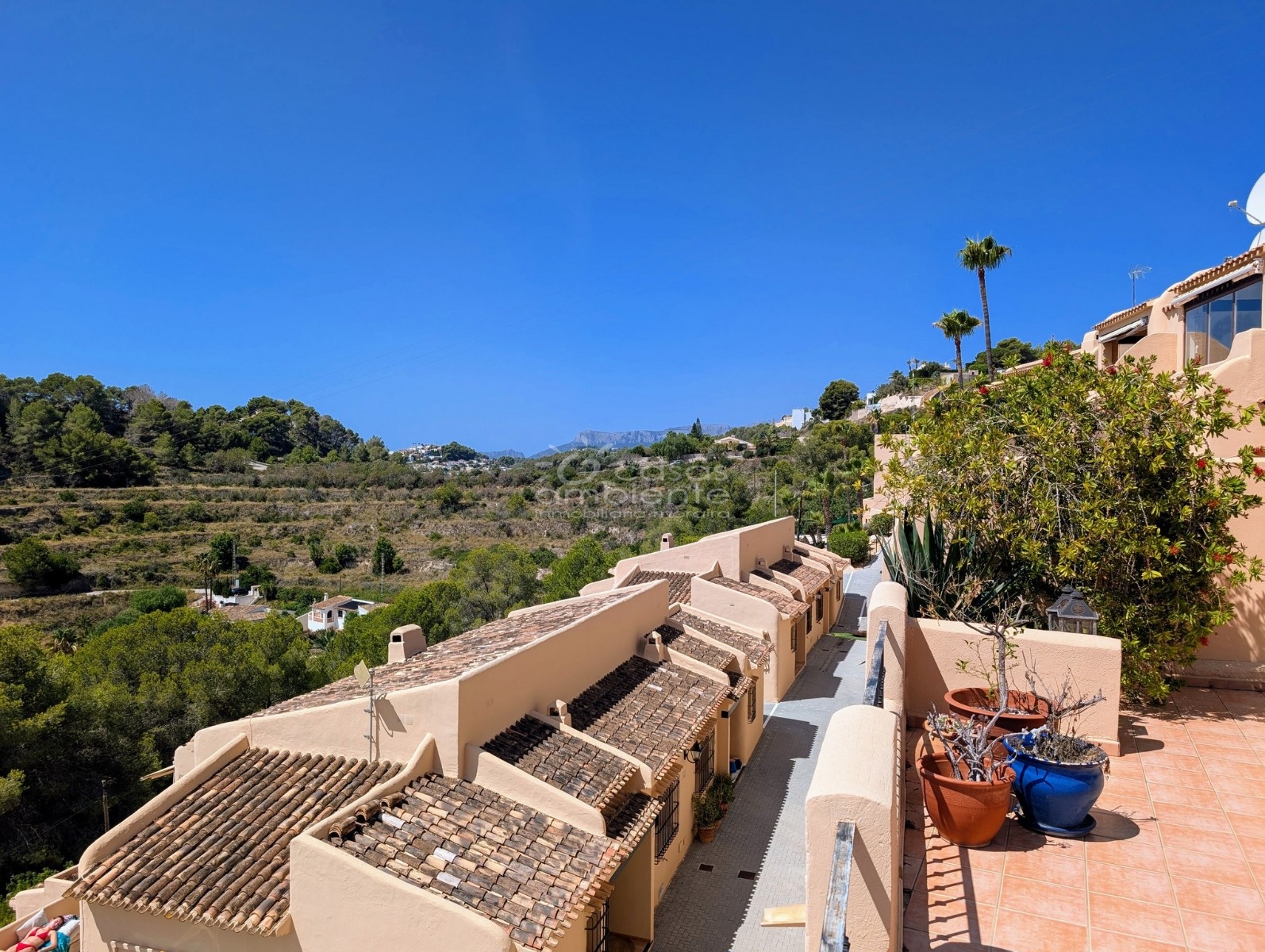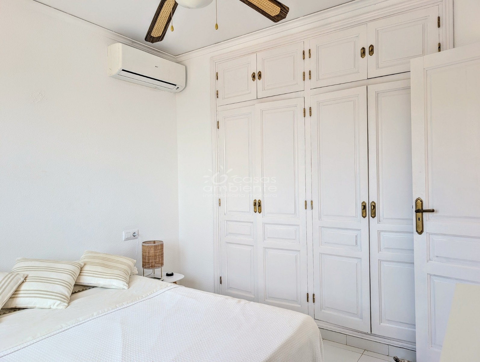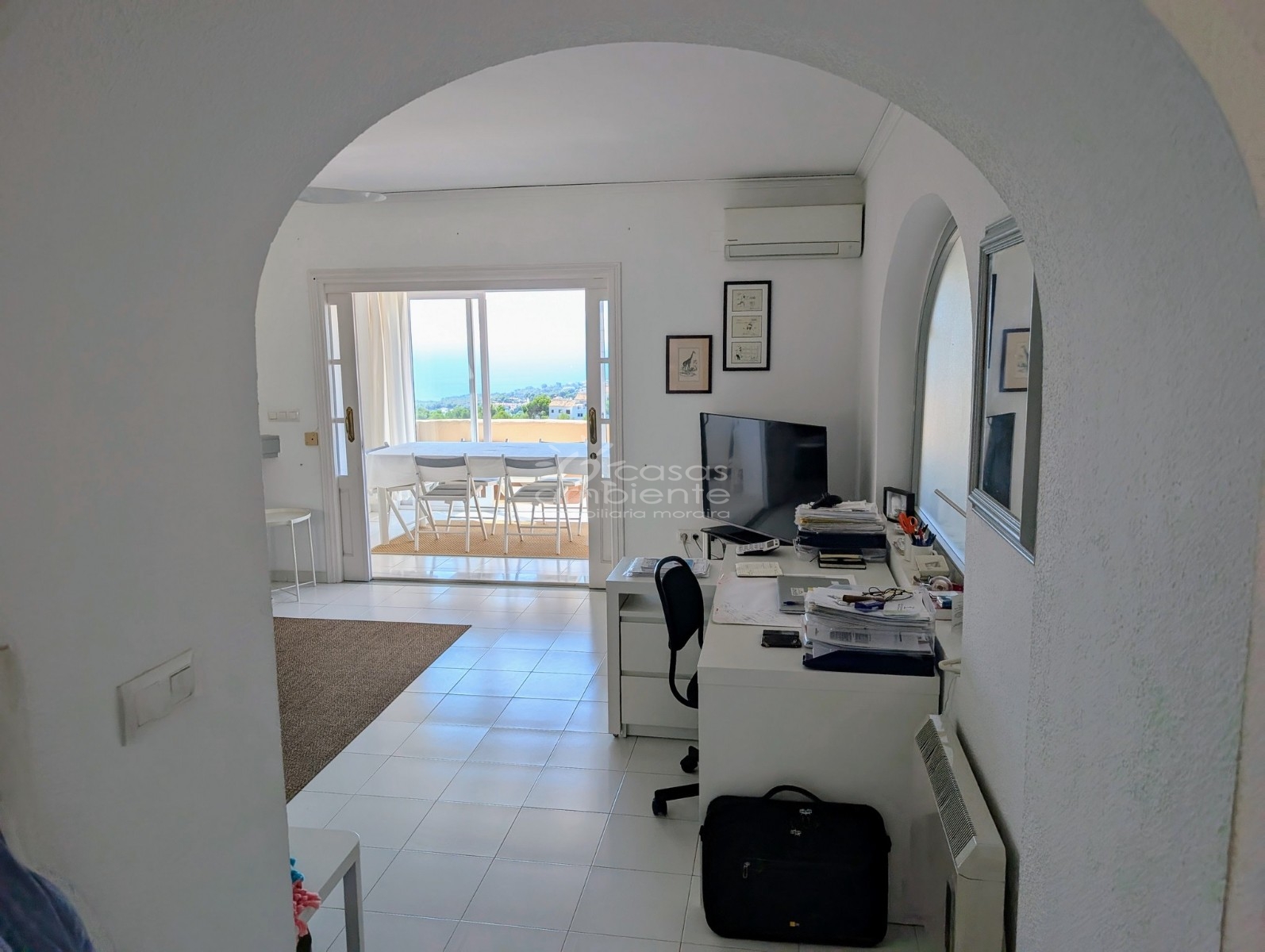 Una escalera bien iluminada conduce a la planta inferior, donde hay dos dormitorios dobles con armarios empotrados, un baño con ducha, un armario para ropa blanca y una gran sala polivalente, ideal para niños o como sala de juegos. Desde esta sala se accede a un pasillo con lavadero, otro baño con ducha y un amplio dormitorio con dos vestidores. La terraza inferior, de unos 96 m², incluye una naya abierta con impresionantes vistas a Moraira y al mar.