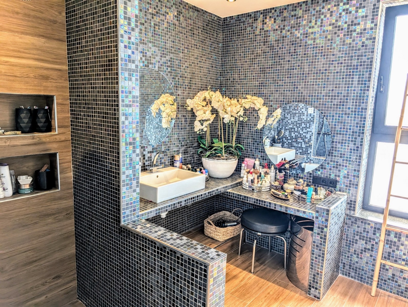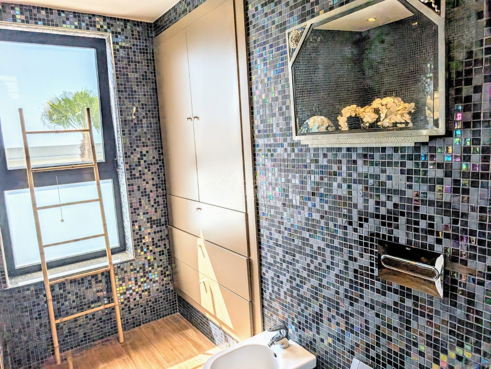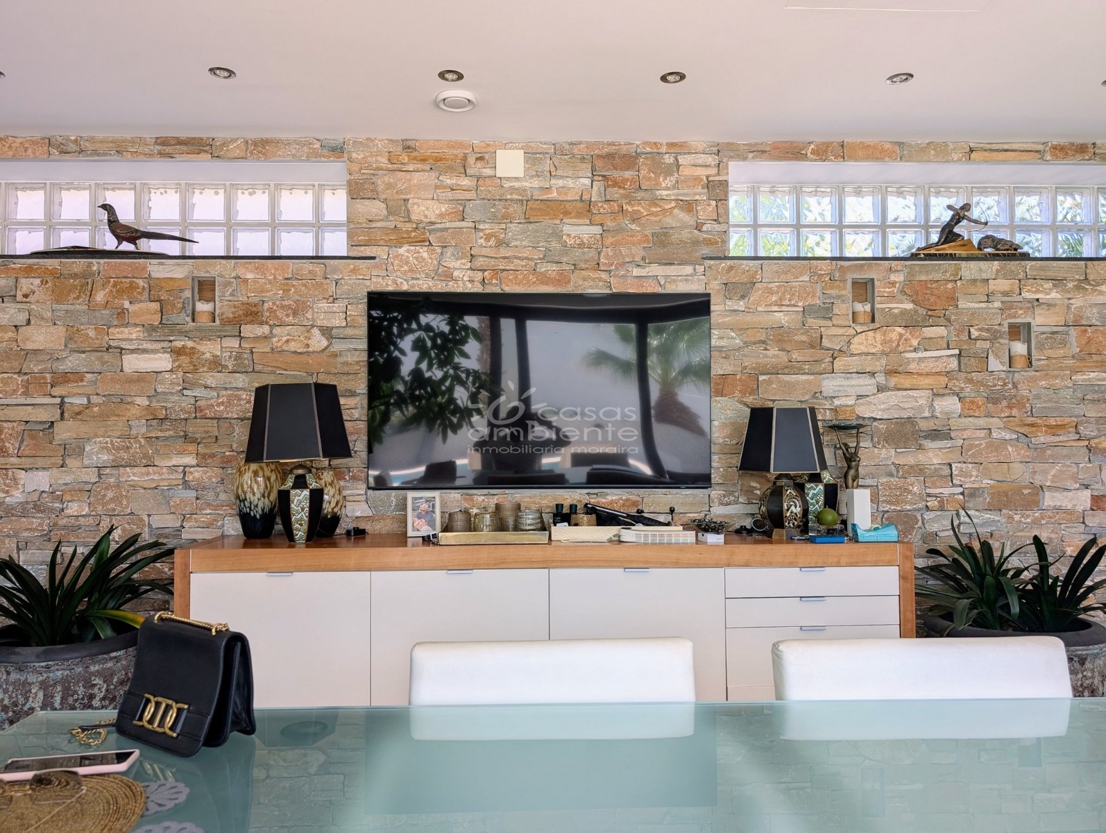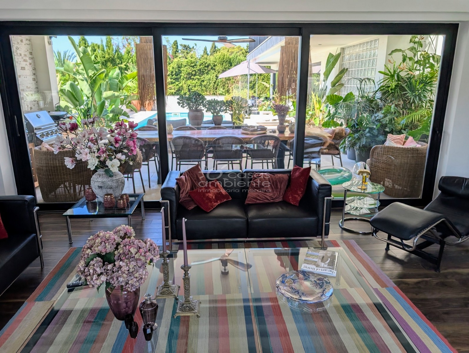 Esta impresionante villa de lujo combina un diseño exótico con arquitectura moderna y se encuentra en la codiciada zona de La Calalga en Calpe. Situada en una parcela de 800 m² con un jardín tropical maduro de bajo mantenimiento, la propiedad ofrece un equilibrio perfecto entre estilo, confort y vida interior/exterior. Al entrar, un amplio recibidor con aseo de invitados y armarios de almacenamiento conduce, pasando por la escalera, a la luminosa cocina, comedor y sala familiar con puertas y ventanas de suelo a techo que dan a la terraza de la piscina. Una pared de piedra aporta un efecto visual impactante. La cocina de diseño está completamente equipada con muebles en crema y madera clara, encimeras de granito negro y electrodomésticos de acero inoxidable. El salón dispone de chimenea contemporánea y acceso directo a la cocina de verano y terraza de la piscina, con dos terrazas cubiertas y escaleras que bajan al jardín.