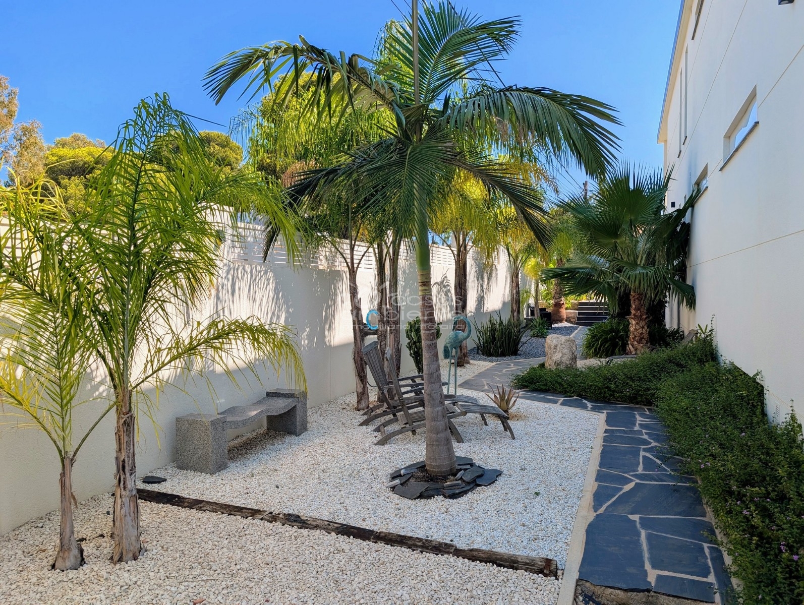 La villa está rodeada por tres lados por un jardín tropical de bajo mantenimiento con plantas maduras, palmeras y árboles frutales con riego automático. La terraza de la piscina es ideal para el relax y el entretenimiento, ofreciendo un estilo de vida interior/exterior excepcional en una ubicación tranquila y prestigiosa.
