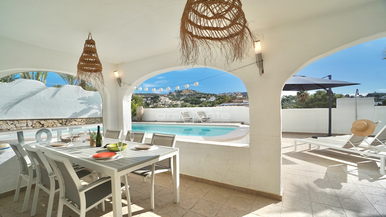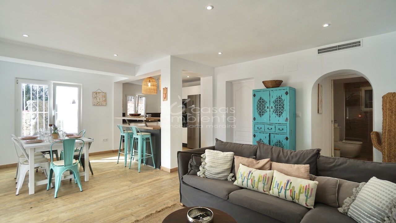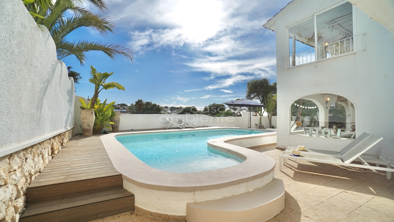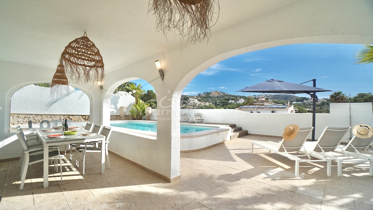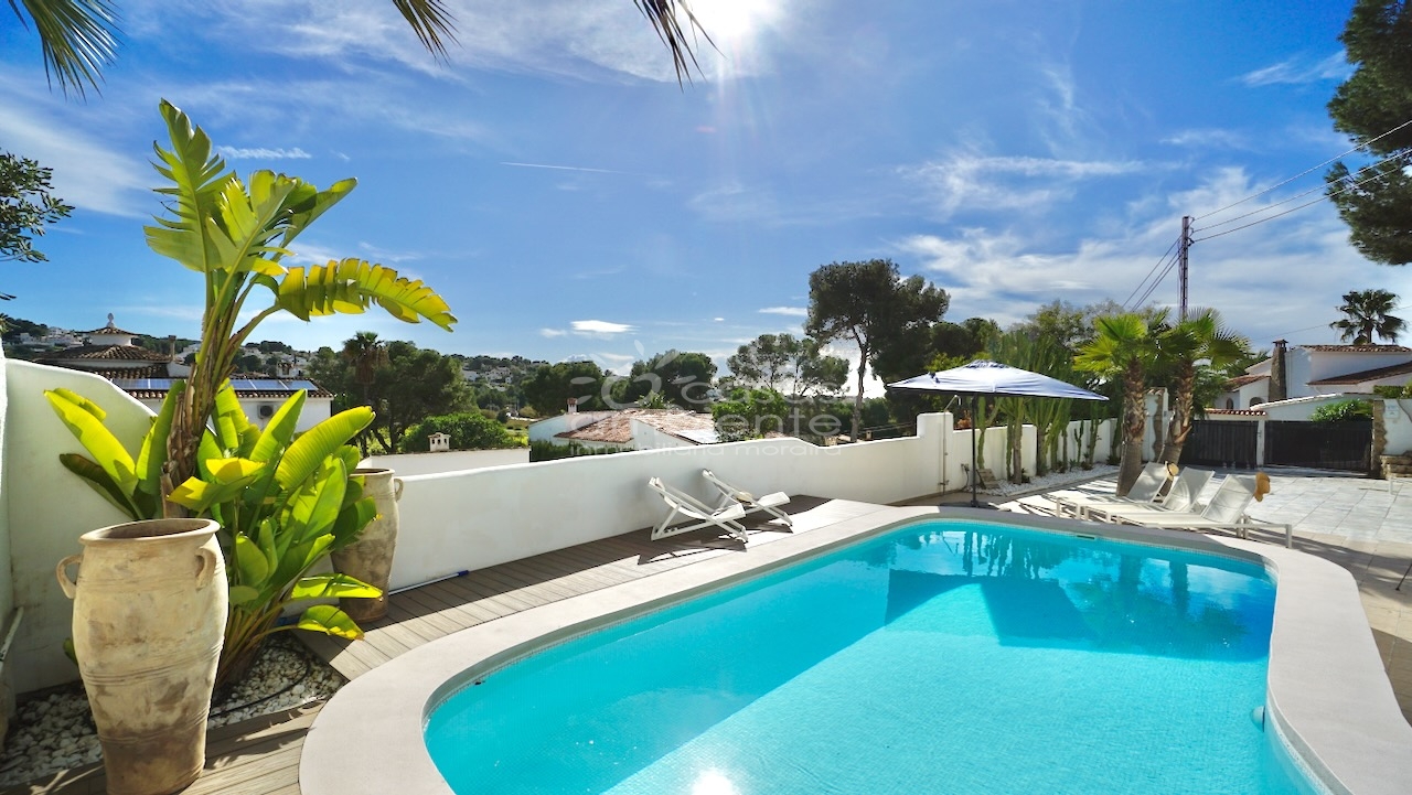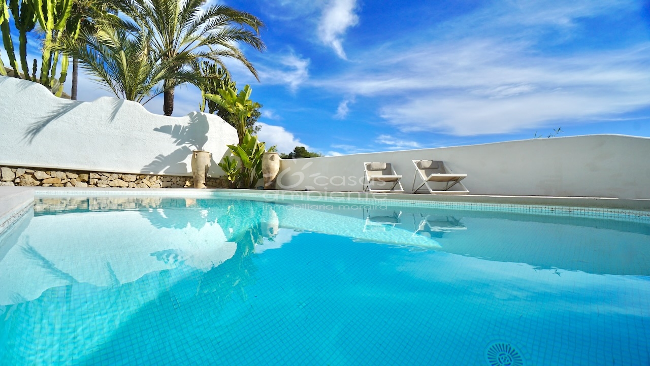 Villa totalmente reformada de estilo ibicenco en venta en Moraira con piscina y apartamento de invitados.