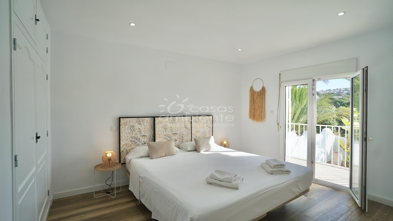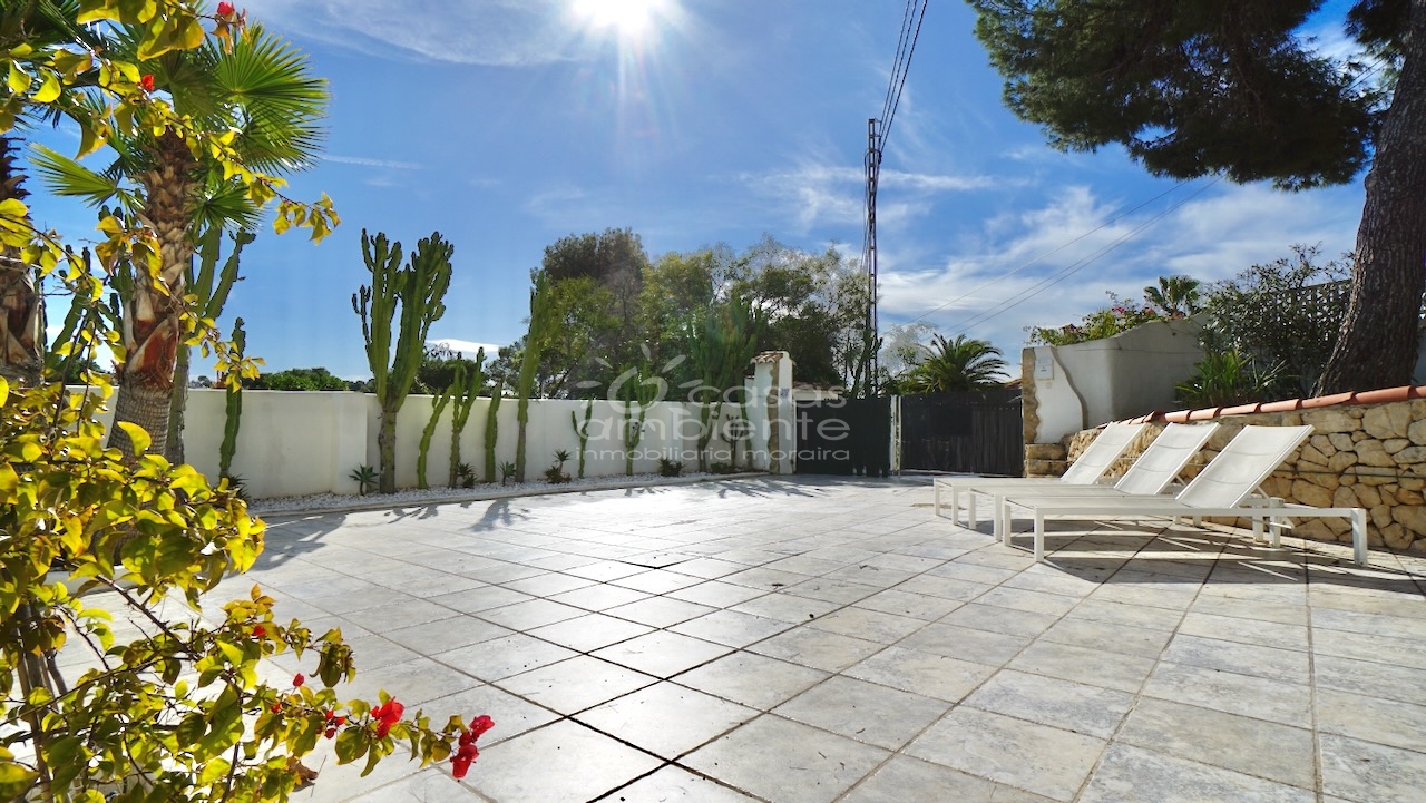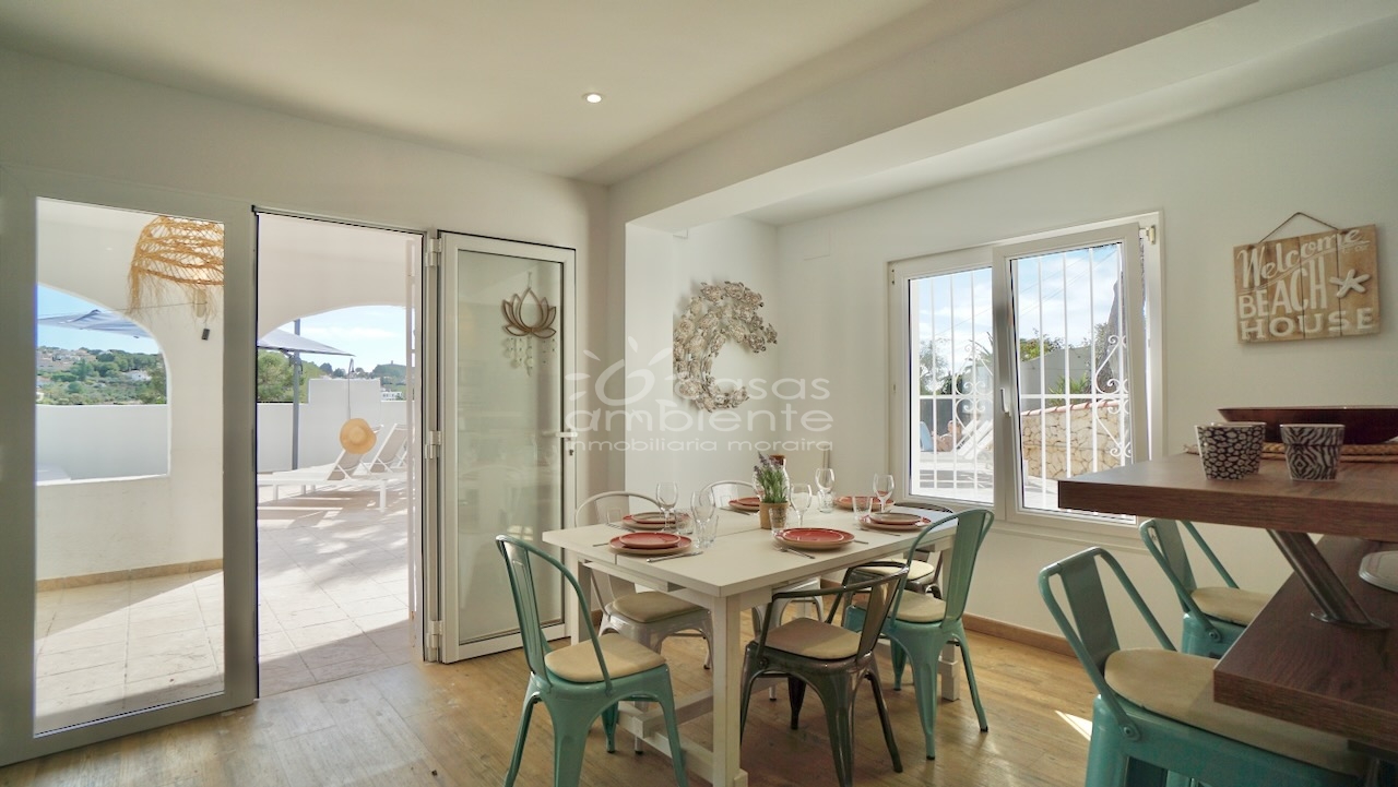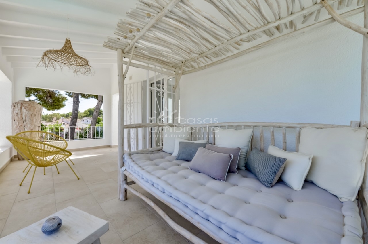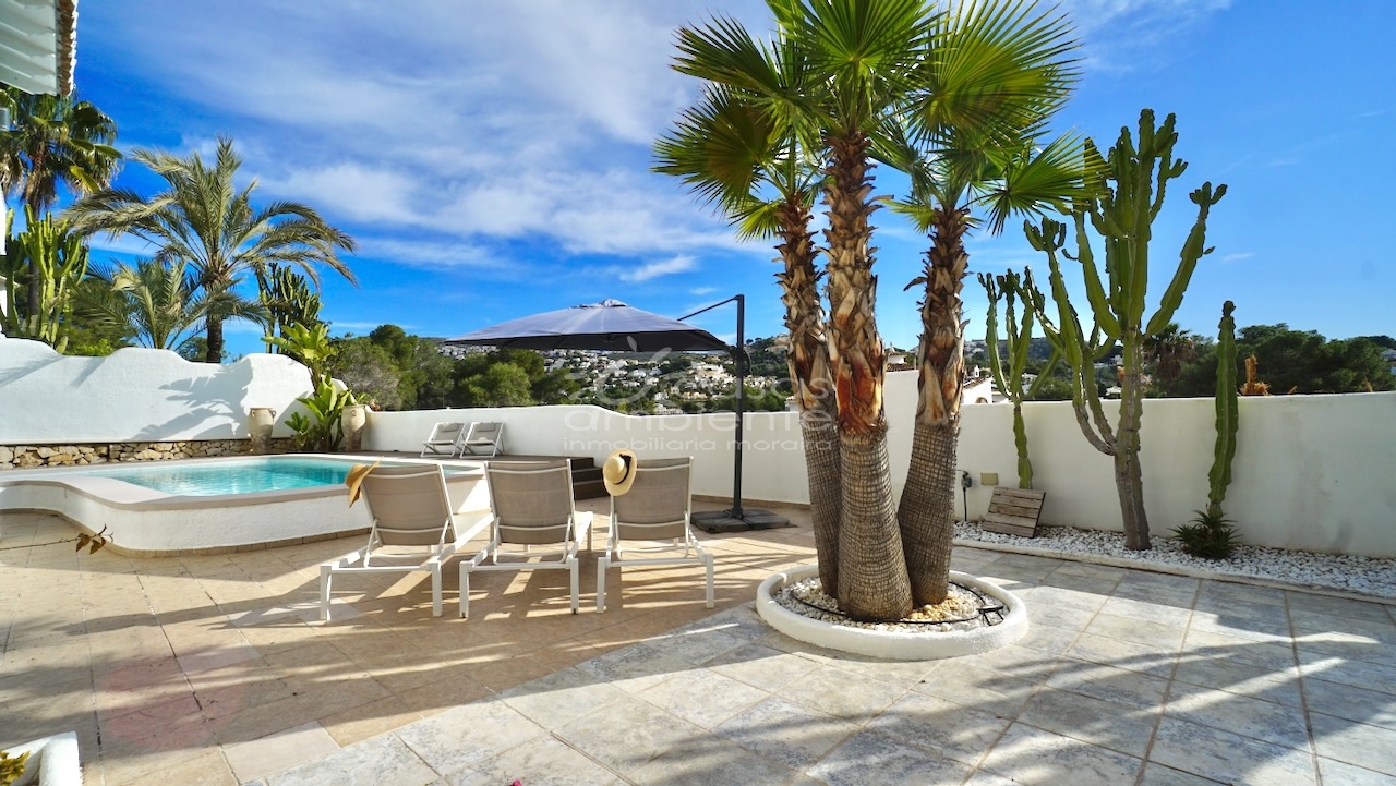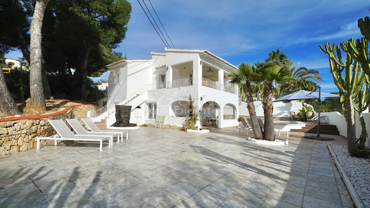 Villa totalmente reformada de estilo ibicenco en venta en Moraira con piscina y apartamento de invitados.
