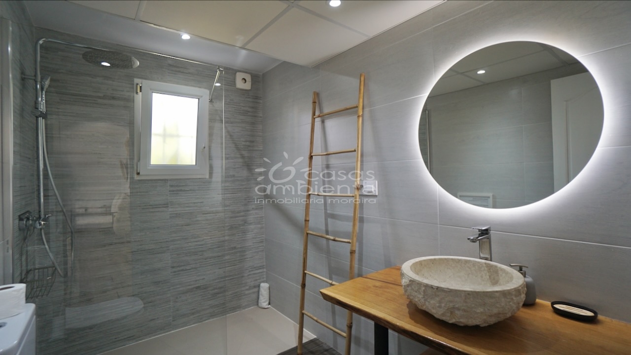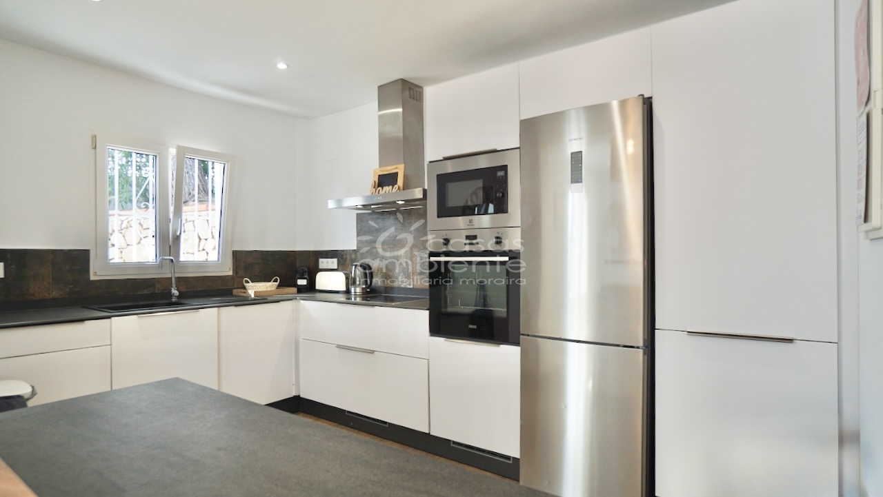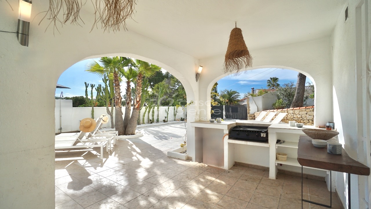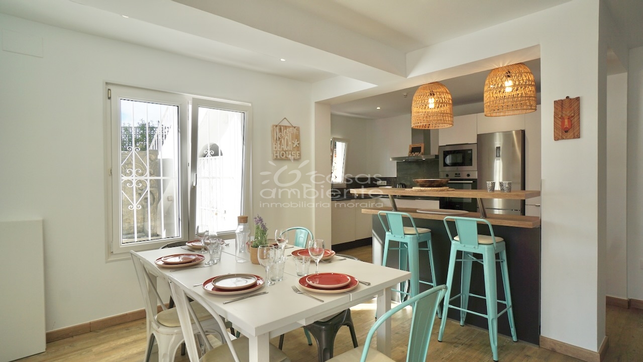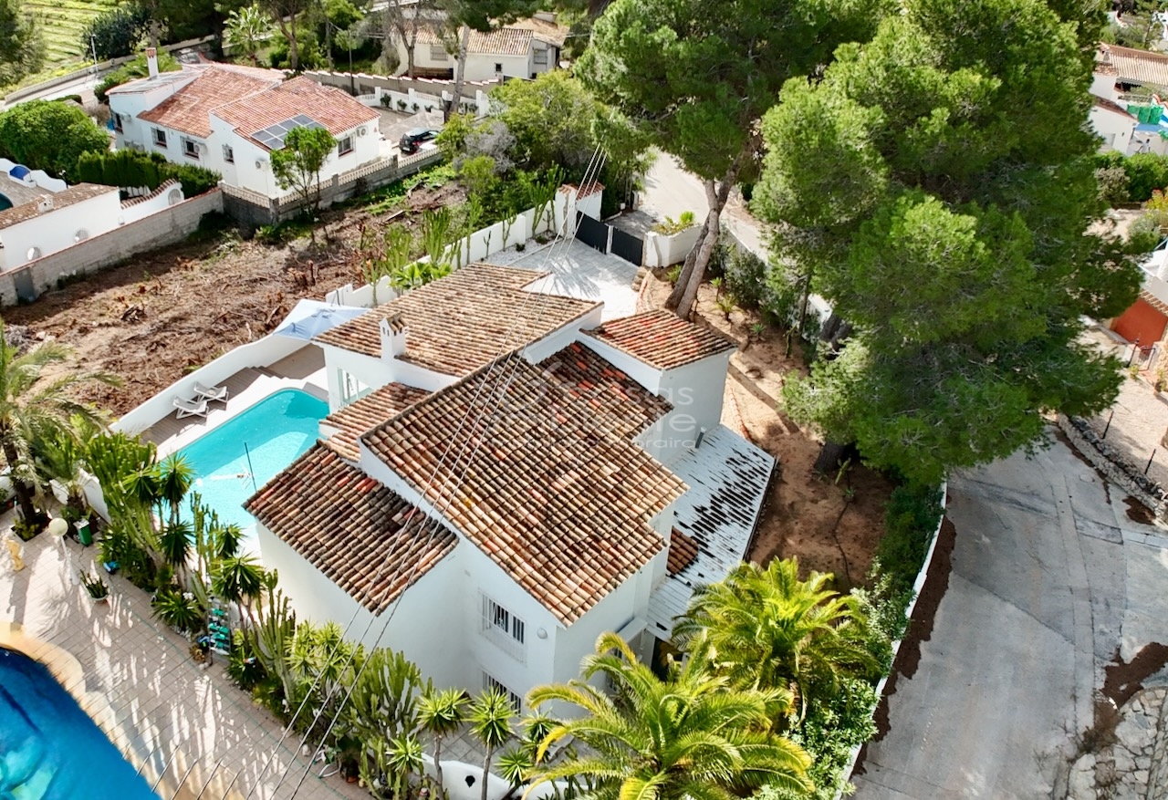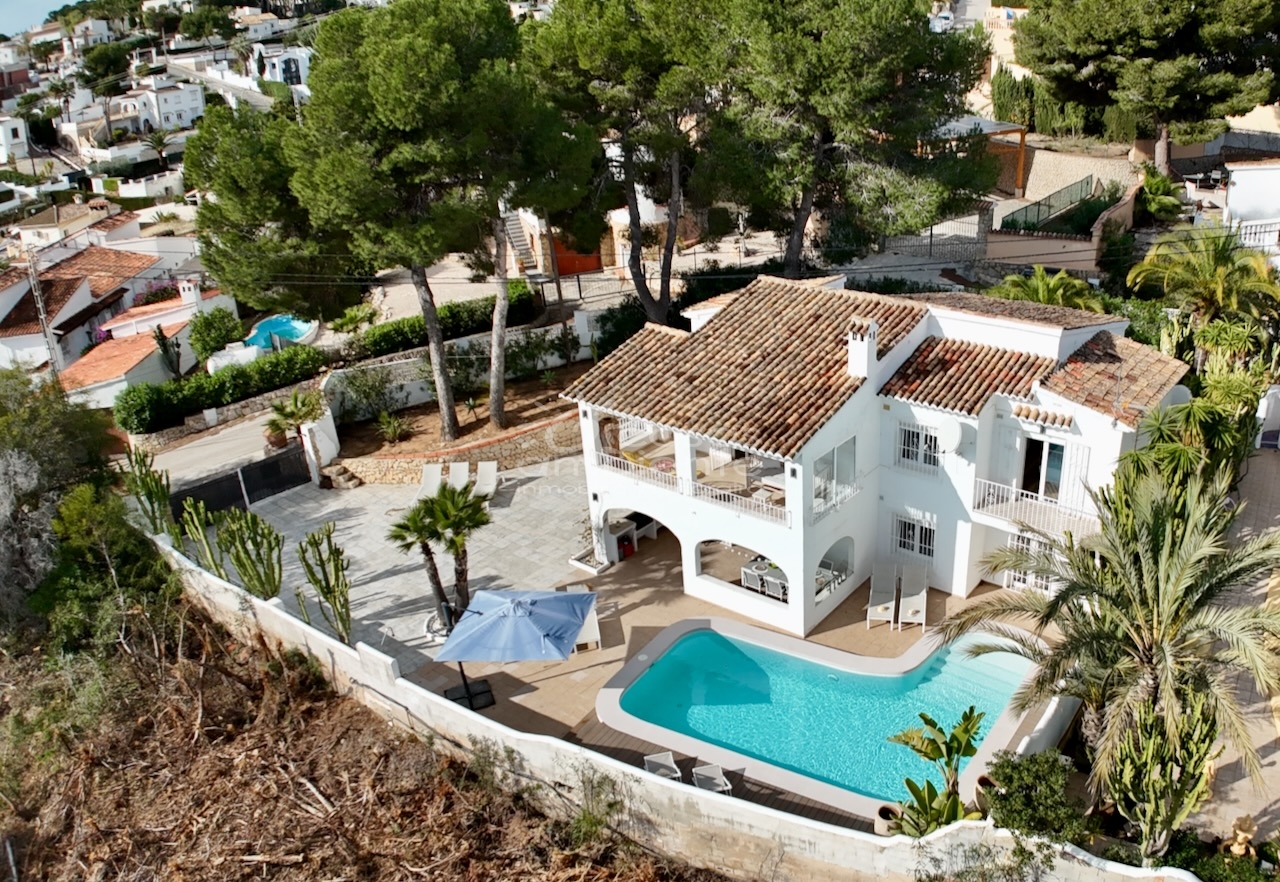 Villa totalmente reformada de estilo ibicenco en venta en Moraira con piscina y apartamento de invitados.