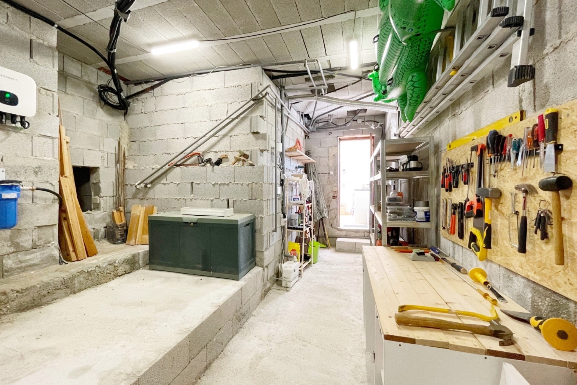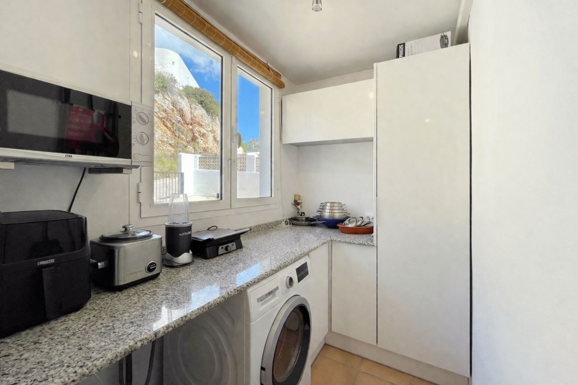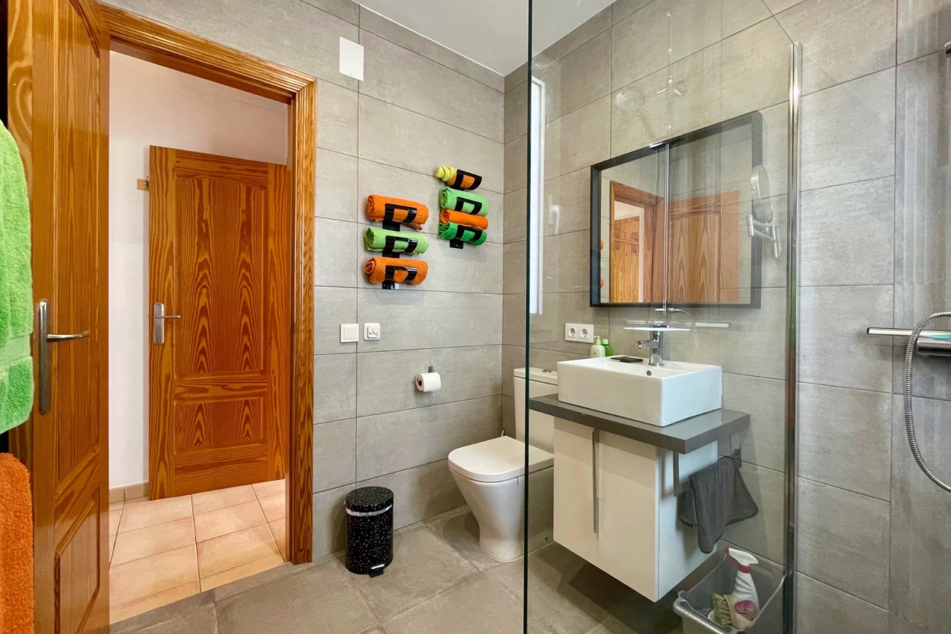 Desde la calle, una puerta da acceso a una plaza de aparcamiento privada con cerradura situada en el propio terreno, y una puerta peatonal independiente conduce, a través del jardín delantero, directamente a la zona de estar de la vivienda, que se encuentra íntegramente en una sola planta. A través del vestíbulo se accede al luminoso salón-comedor con cocina abierta totalmente equipada, que está conectada con un lavadero cerrado donde se encuentra, entre otras cosas, la lavadora. Además, en esta planta encontramos un dormitorio principal con baño en suite, dos dormitorios y un cuarto de baño independiente. Uno de estos dormitorios se utiliza actualmente como despacho. Todos los dormitorios cuentan con armarios empotrados, persianas enrollables, ventiladores de techo y mosquiteras. El salón está directamente conectado con la terraza orientada al sur y parcialmente cubierta, también provista de toldos, desde donde se disfruta de unas amplias vistas sobre el pueblo y el valle. Desde la terraza, una escalera nos lleva a la amplia terraza de la piscina, situada a un nivel inferior, con una piscina climatizada de 8 x 4 m, una cocina exterior, una ducha exterior, mucha privacidad y varios rincones para sentarse. También accedemos a través de esta terraza a la planta baja, que cuenta con una amplia habitación de invitados, compuesta por un salón con cocina abierta, un dormitorio con vestidor contiguo y un cuarto de baño independiente. Aquí también encontramos un amplio trastero. El jardín, maduro y de bajo mantenimiento, está provisto de una iluminación ambiental.
