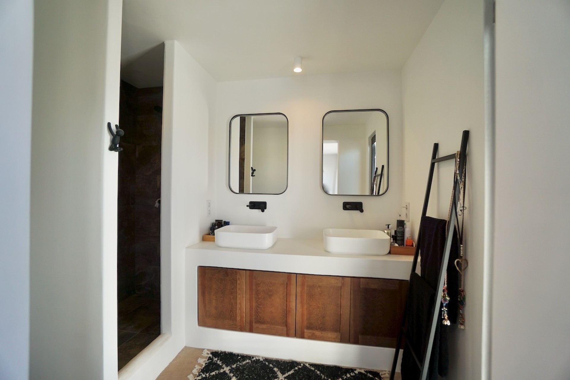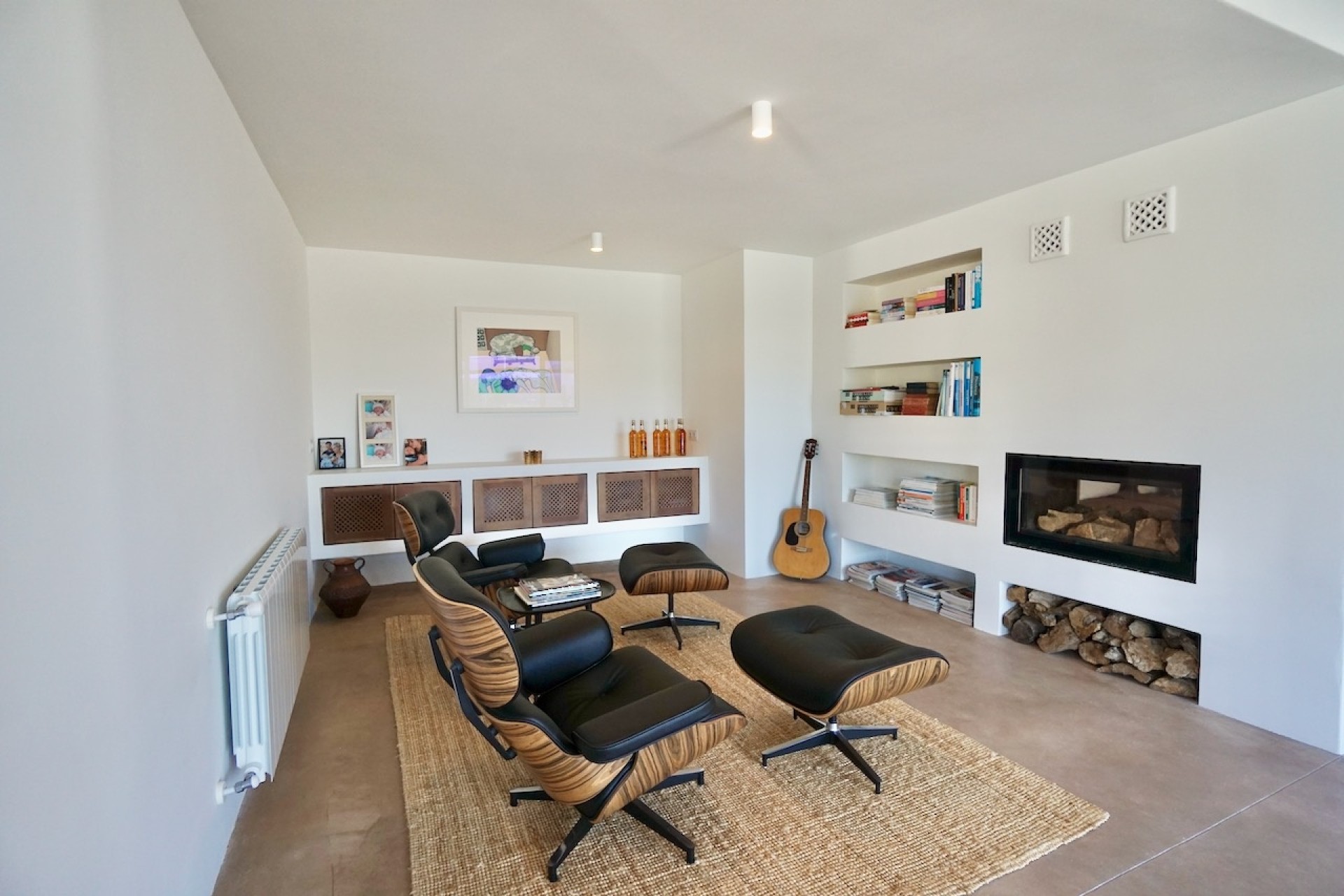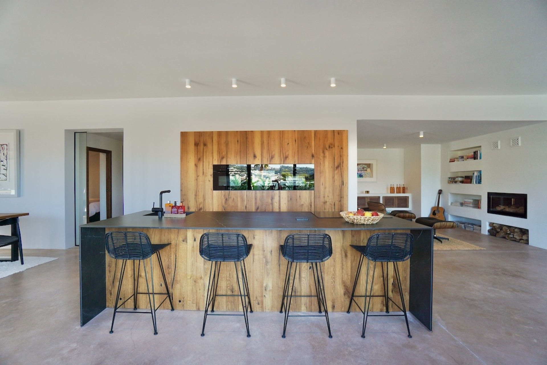 L'entrée de la propriété se fait par un petit couloir qui donne accès à une chambre d'enfants ainsi qu'à la suite parentale avec dressing, salle de douche attenante et portes vitrées menant à la terrasse de la piscine. Du couloir à droite, vous arrivez dans une grande salle de télévision, avec des sièges en béton le long d'un mur, un haut plafond avec poutres apparentes et une superbe cheminée contemporaine encastrée à double façade, qui peut également être utilisée dans le deuxième salle de séjour adjacent.