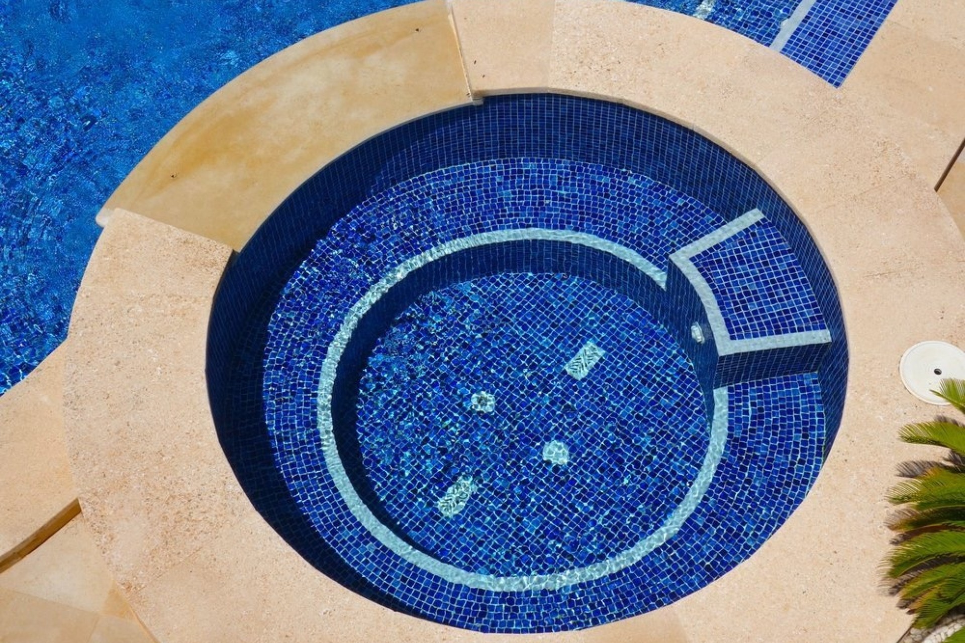 La piscine est divisée en deux parties, une petite de style jacuzzi qui se jette en cascade dans la grande, donnant un son de fontaine de ce côté de la maison.