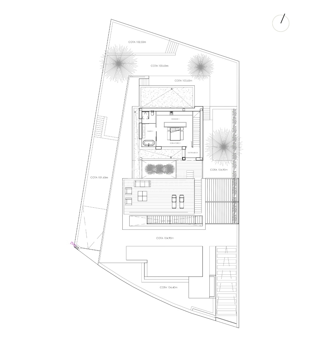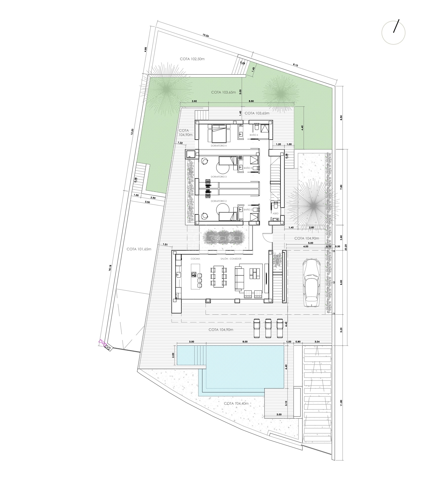 Le rez-de-chaussée comprend un bel espace salon-salle à manger avec cuisine ouverte, donnant directement sur la terrasse et la piscine à débordement. De grandes baies vitrées relient harmonieusement l’intérieur à l’extérieur. À ce niveau, vous trouverez également trois chambres avec salle de bains privative et des toilettes invités.