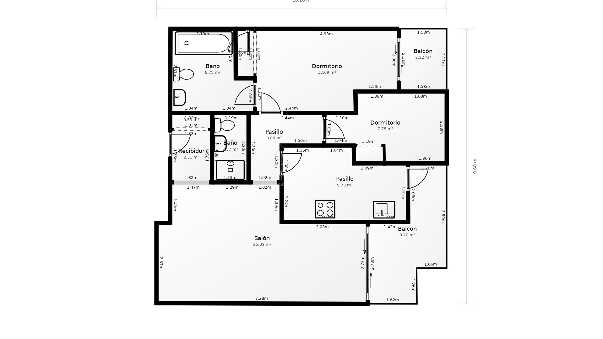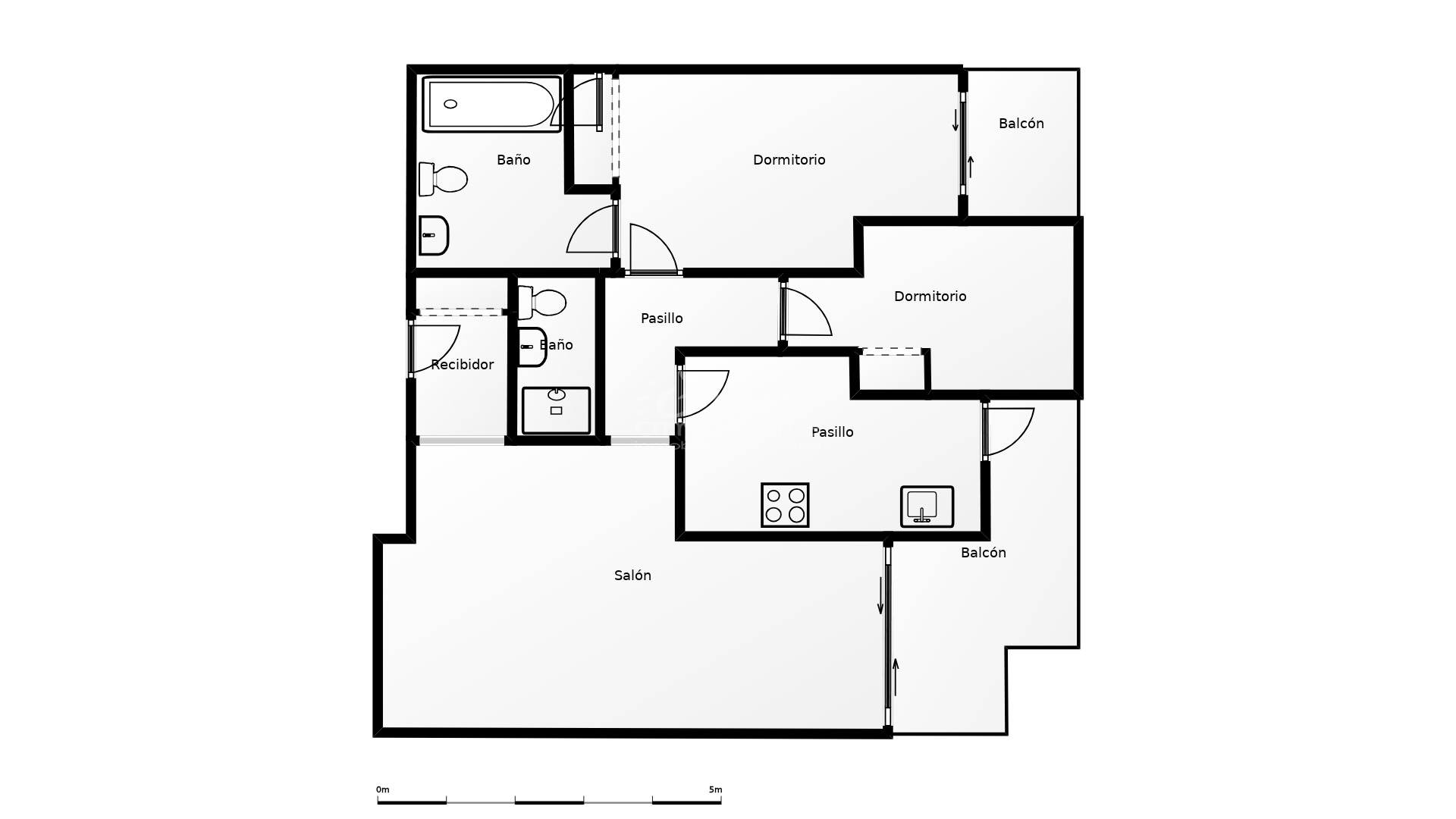 À côté du séjour se trouve une cuisine entièrement équipée, avec électroménagers, lave-linge et petit bar pour le petit-déjeuner. Le couloir mène à une salle d’eau avec WC, ainsi qu’à deux chambres doubles. La chambre principale dispose d’une salle de bain en suite, et toutes deux offrent des placards intégrés, fenêtres à double vitrage avec volets et ventilateurs de plafond.