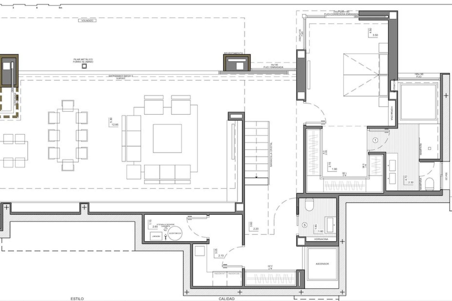 Het interieur zit vol details, decoratieve elementen en lambriseringen die verschillende sferen creëren. Verlichting die warmte brengt in het huis, kamers met plafonds van dubbele hoogte, glazen wanden die samenkomen aan één kant en die zodoende de veranda en de woonkamer verbinden; allemaal exclusieve details die een unieke villa creëren.
