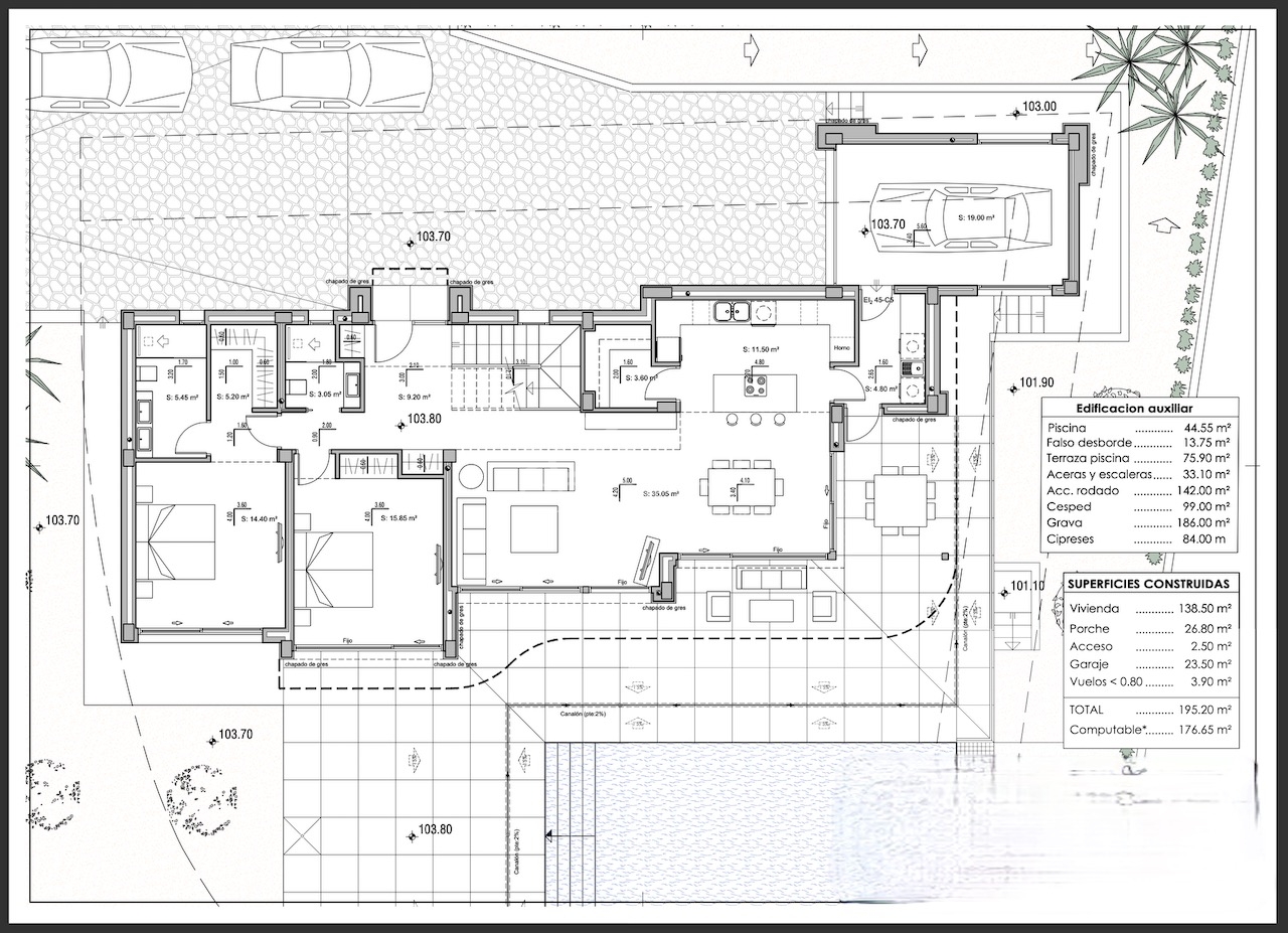 Extra functies zijn onder andere vloerverwarming, geïntegreerde airconditioning, zonnepanelen en dubbel glas met horren en elektrische rolluiken, die het hele jaar door comfort en energie-efficiëntie garanderen. De woning bevat ook praktische elementen zoals een wasruimte, elektrische poorten, een garage en vier extra parkeerplaatsen op de oprit, evenals een onderhoudsvriendelijke tuin.