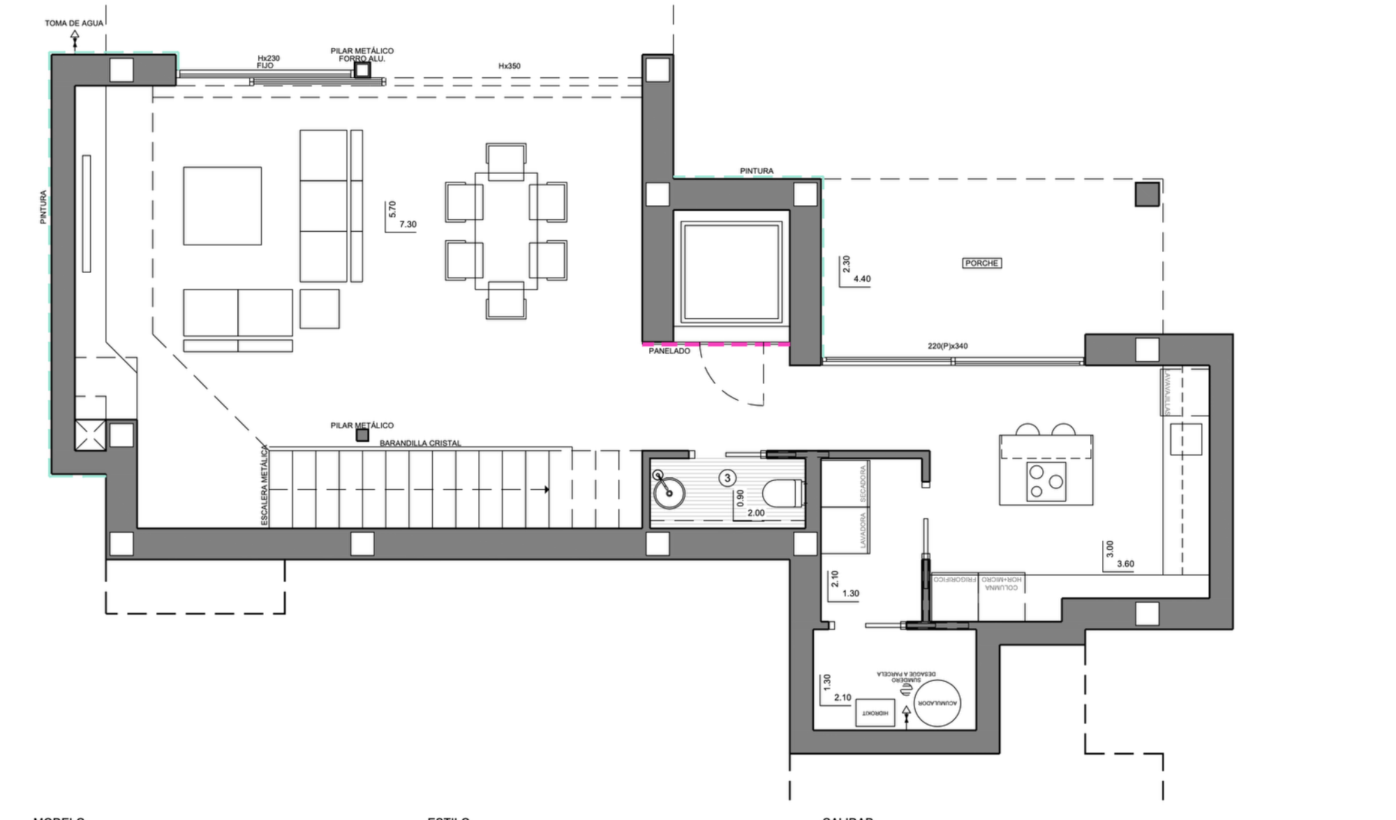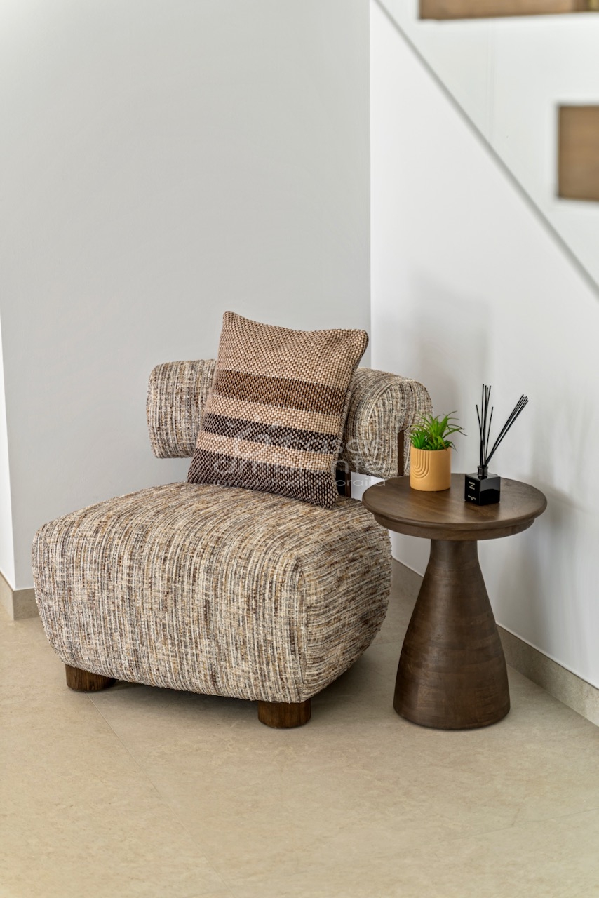 Van hieruit leidt een elegante trap naar de begane grond, waar zich de gemeenschappelijke ruimtes bevinden. De woonkamer, eetkamer en keuken vormen een open geheel en zijn verbonden met een groot buitenterras met een overloopzwembad – perfect om van de omgeving te genieten.