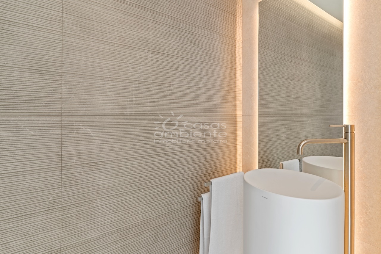 Het zwembad speelt een centrale rol in de buiteninrichting van deze luxe villa aan de Costa Blanca. Niet alleen als ontspanningselement, maar ook esthetisch. De strategische ligging op het hoofdterras biedt adembenemende panoramische uitzichten. De infinity-rand versterkt het gevoel van één worden met de horizon en omlijst het iconische beeld van de Peñón de Ifach.