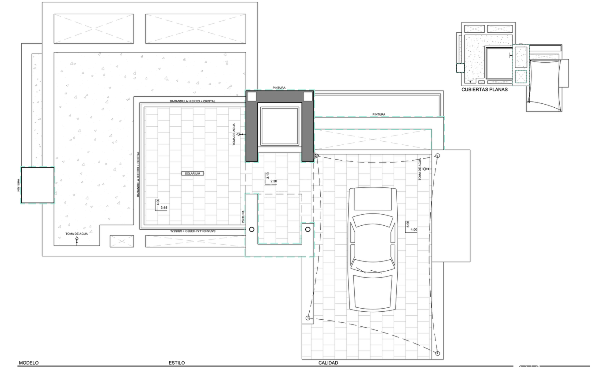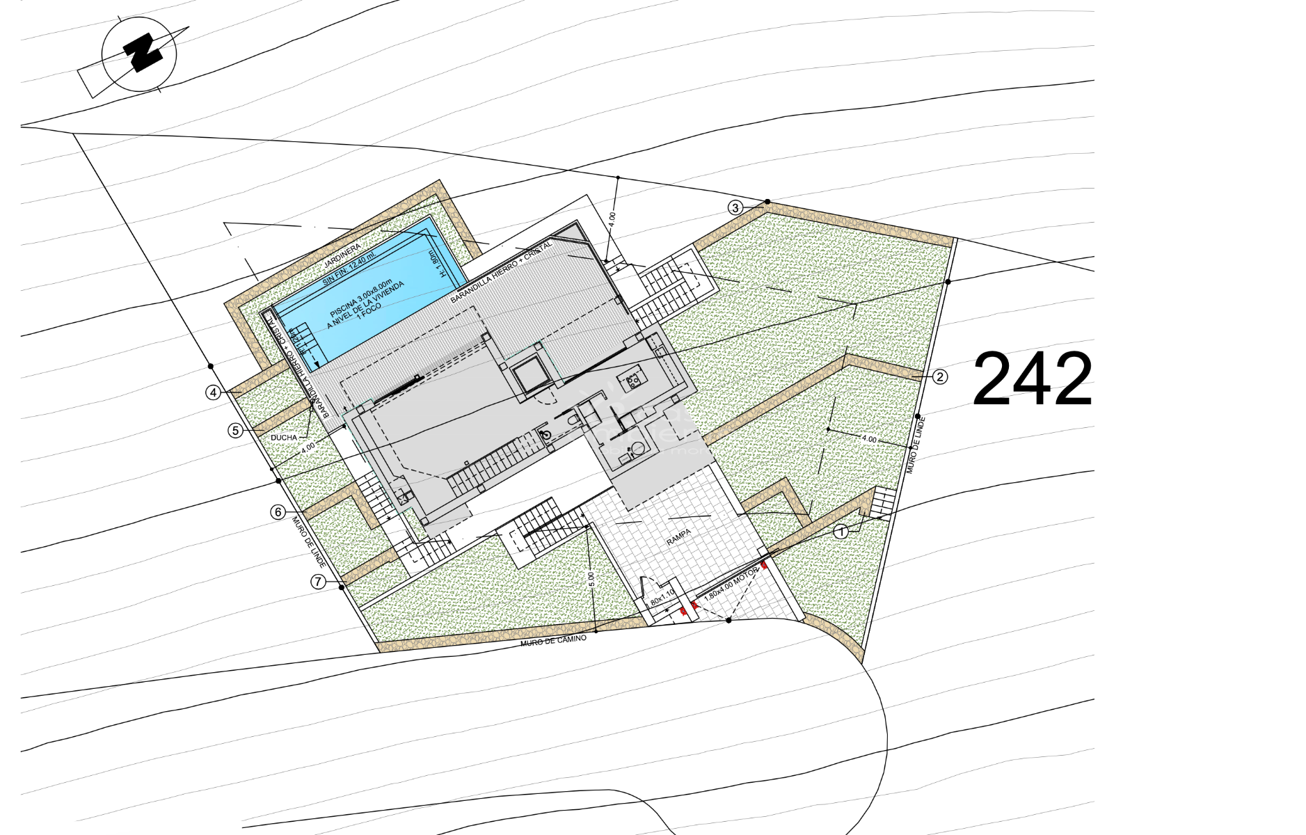 Deze villa is ontworpen over vier niveaus. De toegang tot de woning bevindt zich op de bovenste verdieping, waar een met een zeildoek overdekte parkeerplaats en een lift naar de overige verdiepingen aanwezig zijn.