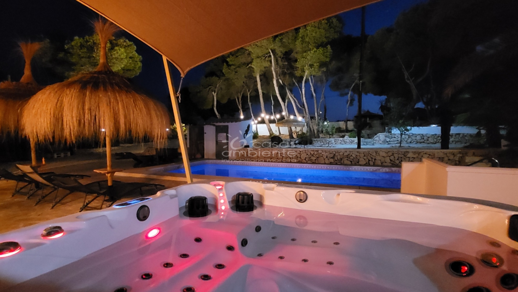 De buitenruimtes zijn ontworpen voor een mediterrane levensstijl en beschikken over een automatische zoutwaterzwembad van 8x4 m met terras, een jacuzzi, een buitendouche (warm/koud), een zomerkeuken met een overdekt terras van 37 m² voor het zwembad en verschillende gezellige zit- en eetgedeelten. Een aparte 20 m² grote, airconditioned ruimte is ideaal als kantoor of kleine fitnessruimte. De tuin is onderhoudsarm en groen, met fruitbomen, planten en sfeervolle nachtverlichting. De villa beschikt tevens over een carport, parkeerplaatsen voor meerdere auto’s of een camper en een ruime berging.