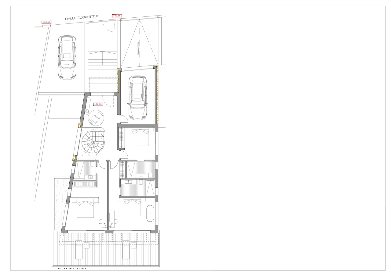 De villa is verdeeld over twee verdiepingen, ontworpen met oog voor functionaliteit en stijl. Op de bovenverdieping bevindt zich de hoofdingang die toegang biedt tot drie ruime slaapkamers, elk met een eigen badkamer en suite. Twee van deze suites beschikken bovendien over een privébalkon met prachtig uitzicht. Een garage en extra parkeerplaats buiten maken dit niveau compleet.