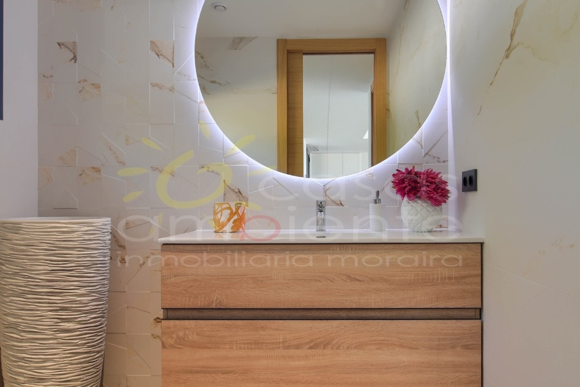 De woning staat op een verhoogd perceel van 985 m² met zuidligging en wordt omringd door mooi aangelegde tuinen en natuurstenen muren die privacy en rust garanderen. Vanuit de villa geniet u van prachtig uitzicht op de Middellandse Zee en de omliggende bergen, terwijl het centrum van Moraira met stranden, jachthaven, restaurants en winkels op slechts enkele minuten rijden ligt.