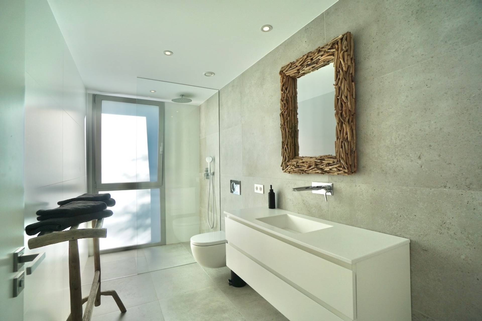 An internal or external staircase leads us to the first floor of this unique villa! Here we find 2 very big bedrooms with fitted wardrobes and ensuite bathrooms, both of which also have access to the spacious terrace with beautiful sea views. Here you can enjoy the sun all day long.