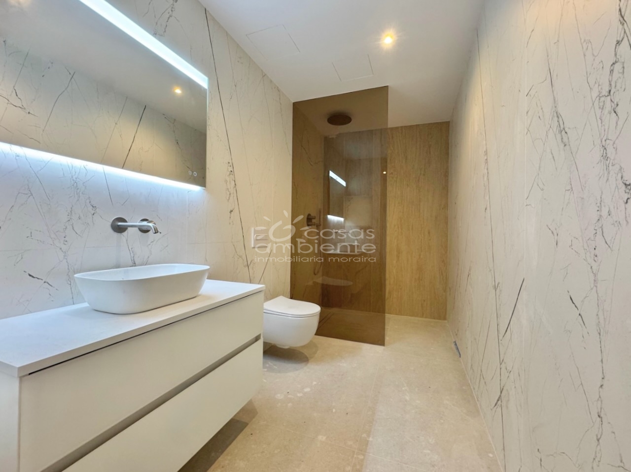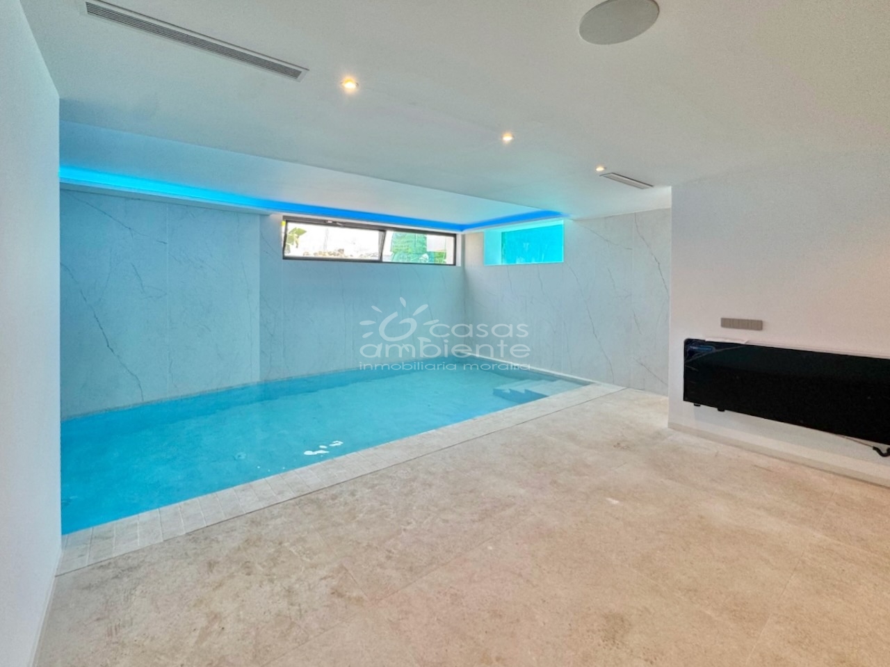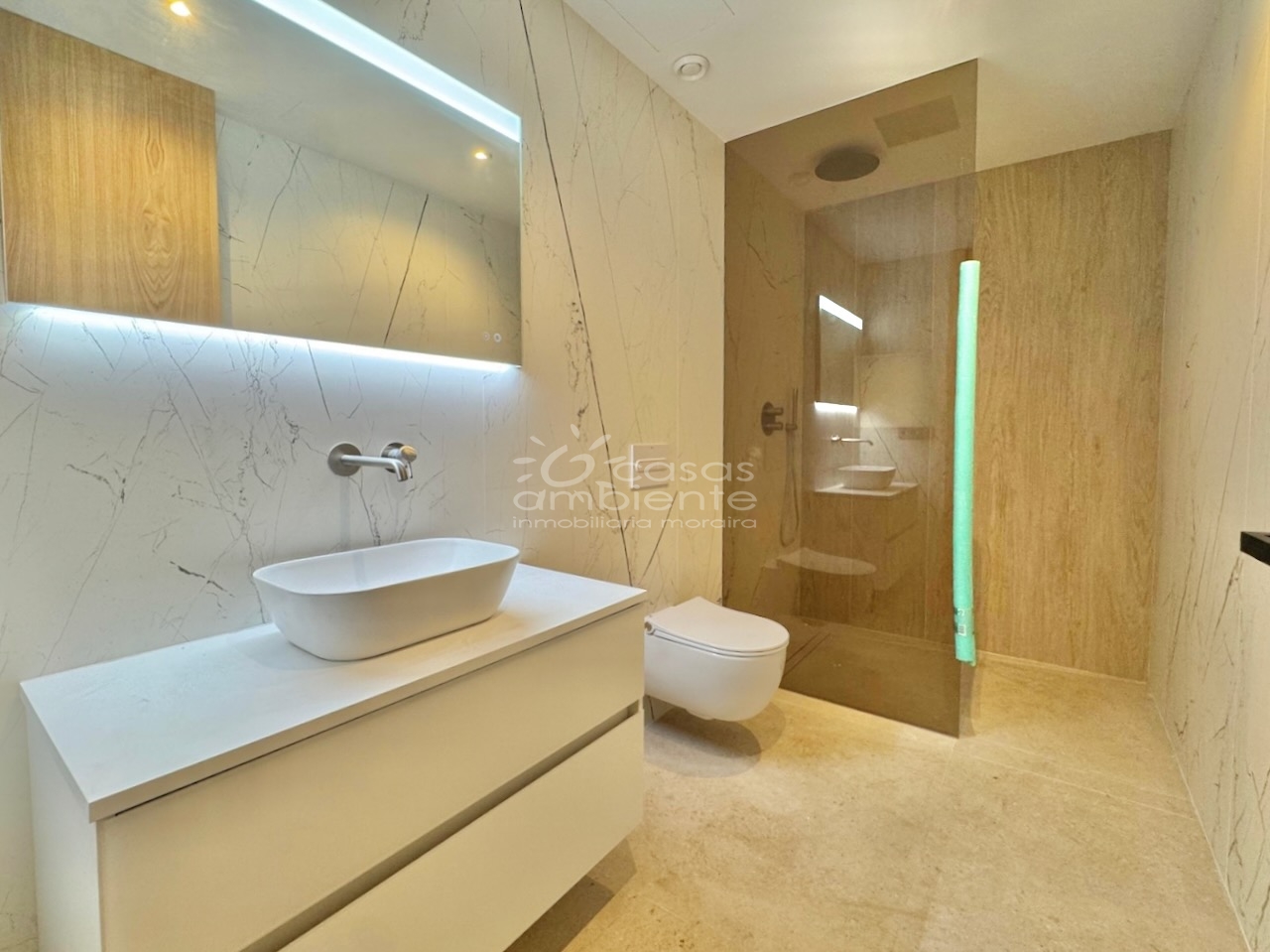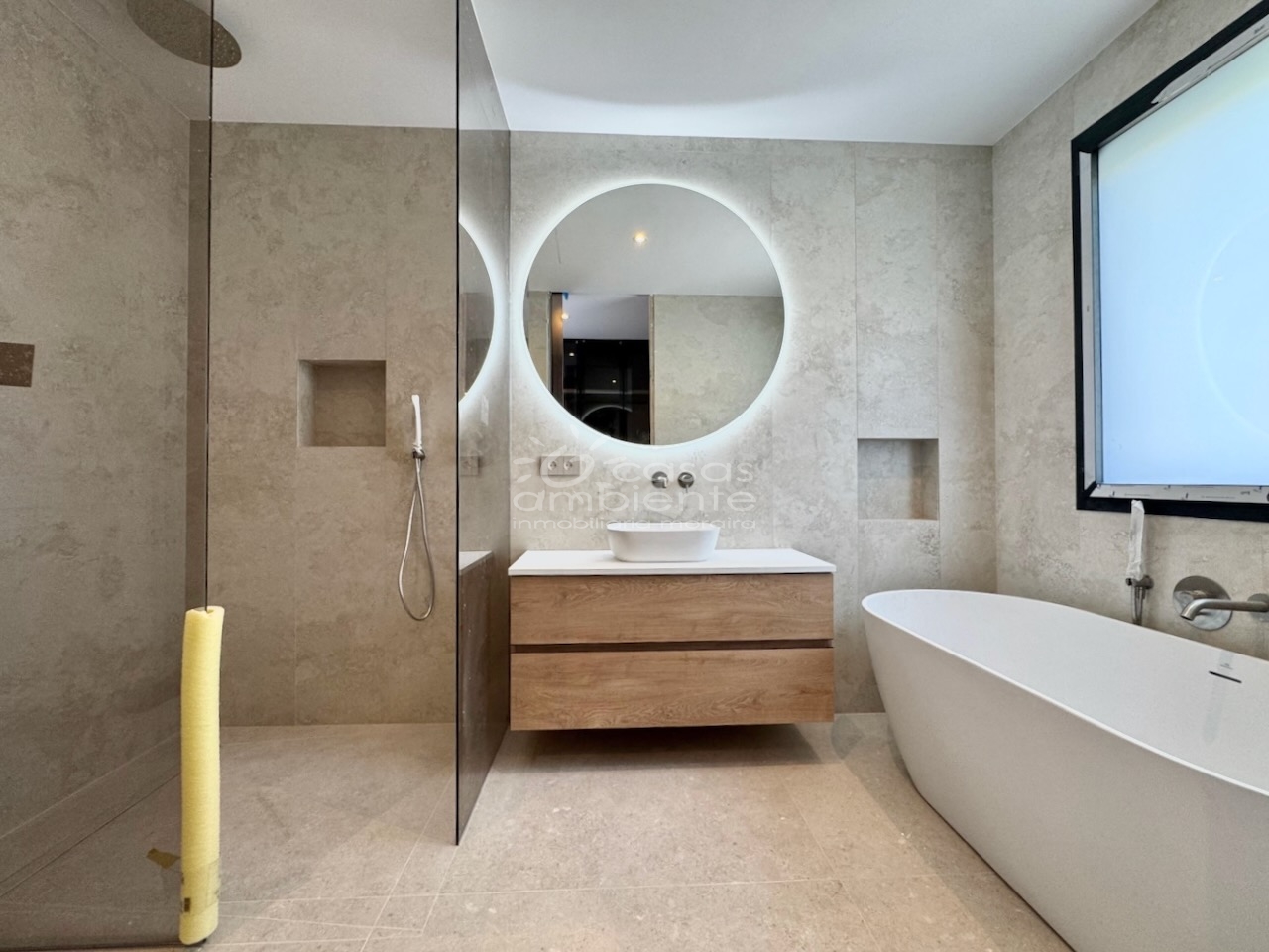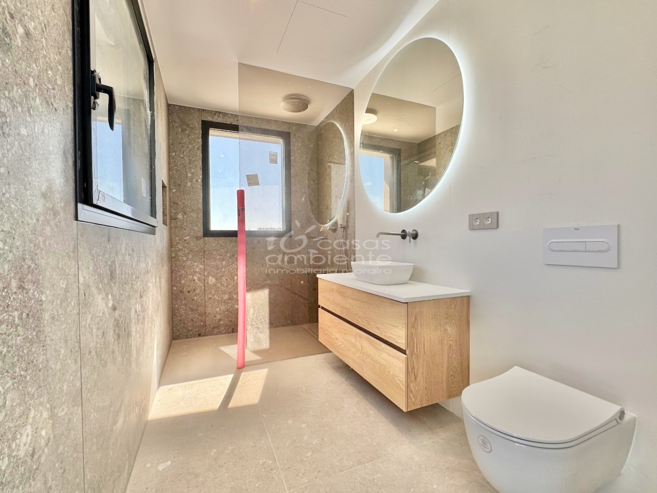 On the ground floor of well over 200m2 we find a heated indoor pool, sauna, cinema, games room and laundry room. Here you will also find a separate toilet. On the ground floor we find the living room, kitchen and the spacious infinity swimming pool. Enjoy beautiful views of the sea and towards Moraira all day long. A beautiful garden with tropical plants will also be laid out around this exclusive villa! Outside, there will also be a porch and an outdoor kitchen. Further on these floors we find the first two bedrooms with 2 bathrooms and a separate guest toilet.