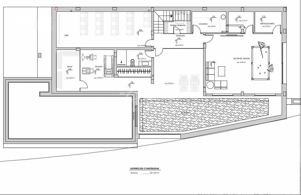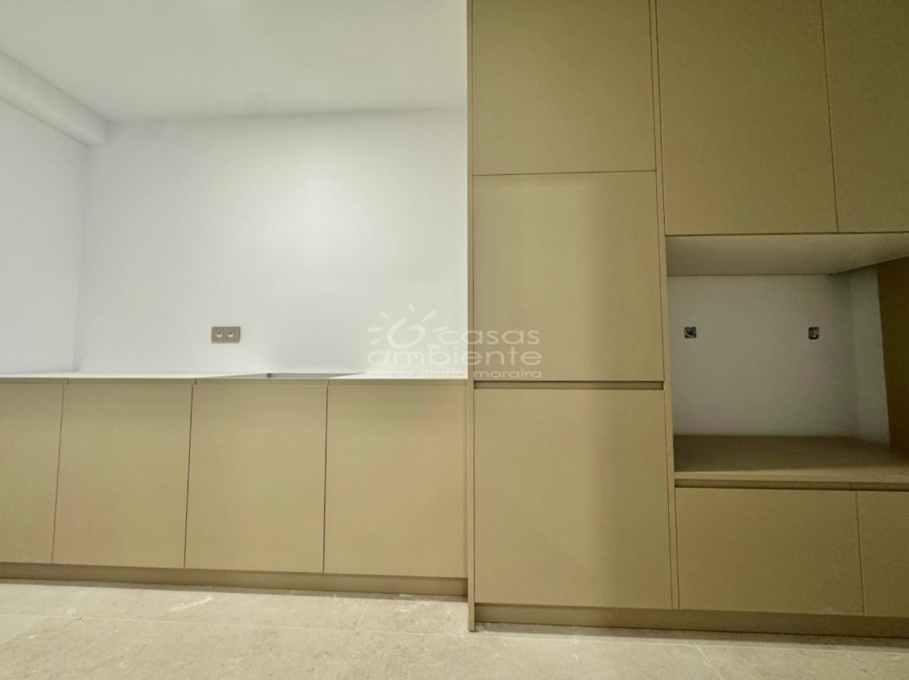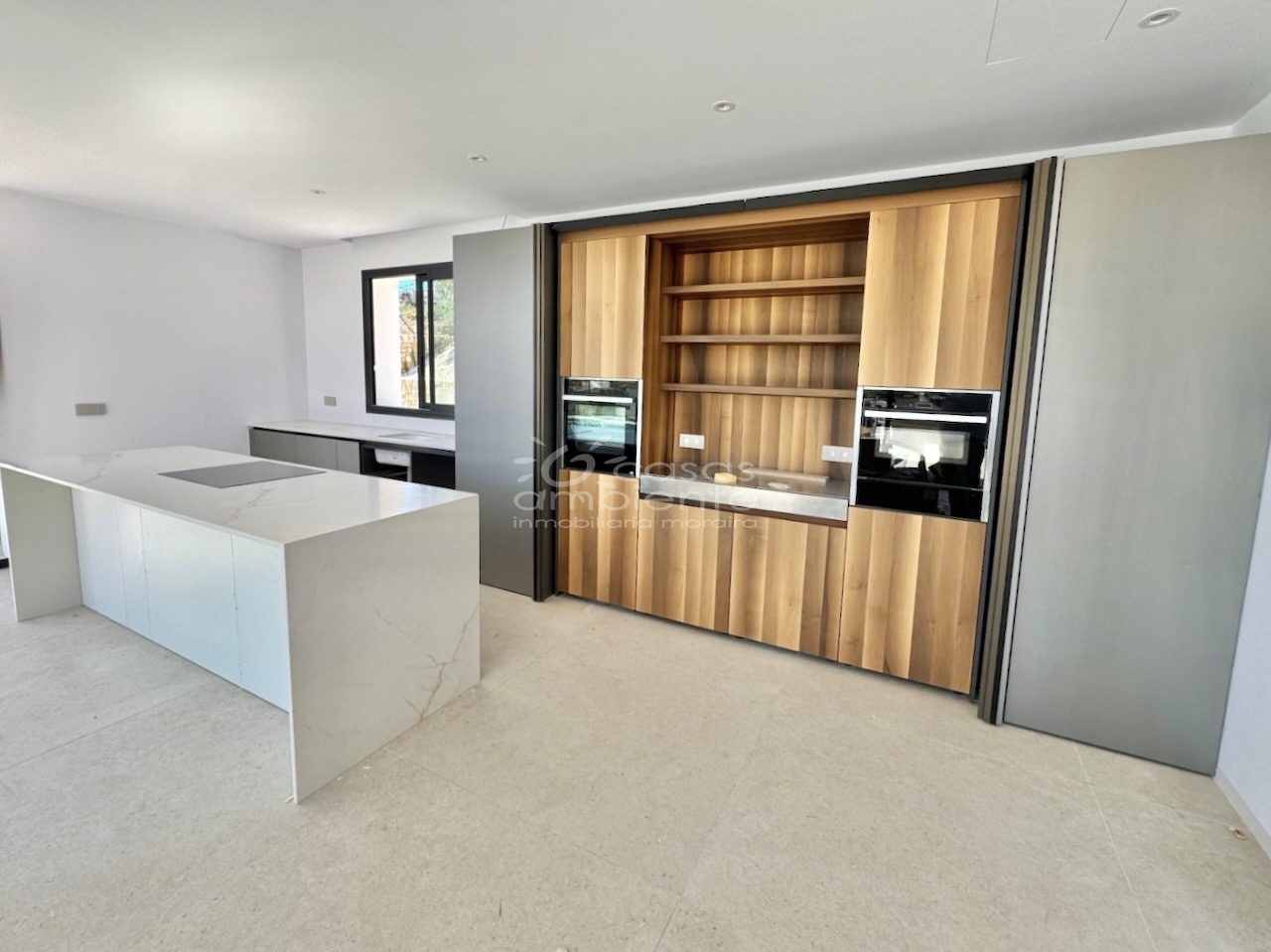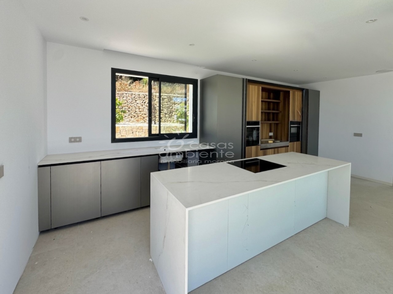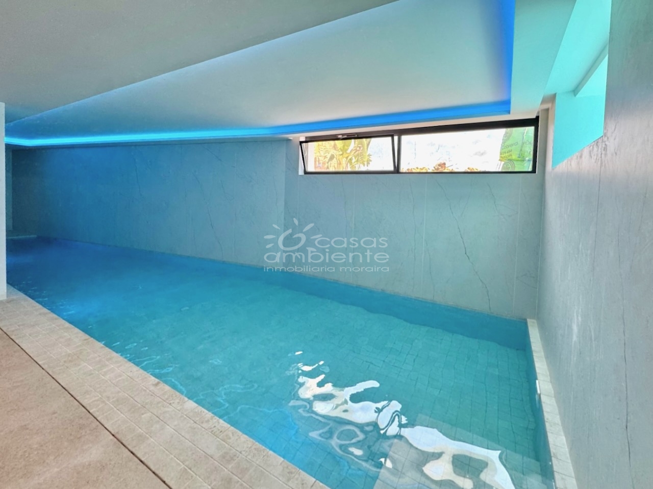 On the ground floor of well over 200m2 we find a heated indoor pool, sauna, cinema, games room and laundry room. Here you will also find a separate toilet. On the ground floor we find the living room, kitchen and the spacious infinity swimming pool. Enjoy beautiful views of the sea and towards Moraira all day long. A beautiful garden with tropical plants will also be laid out around this exclusive villa! Outside, there will also be a porch and an outdoor kitchen. Further on these floors we find the first two bedrooms with 2 bathrooms and a separate guest toilet.