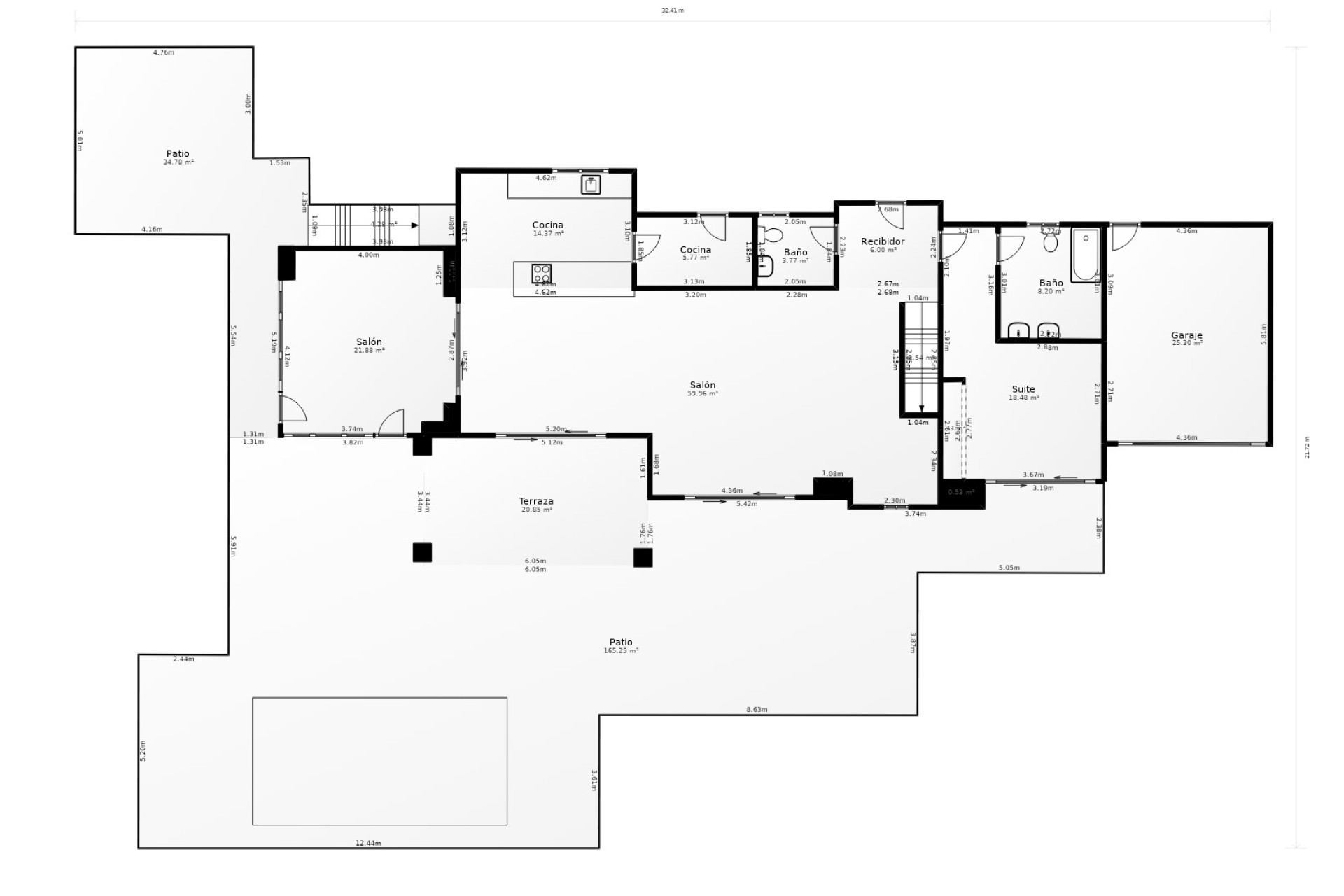 As you enter the house, you immediately notice how much light there is, thanks to the many large windows throughout the whole property. There is a beautifully renovated double bedroom on this floor, featuring two large built in wardrobes as well as its own en suite bathroom with double sink bathtub. To make this room even more special, there are large glass sliding doors leading out to the garden and pool area. A separate guest toilet on this floor is an added convenience.