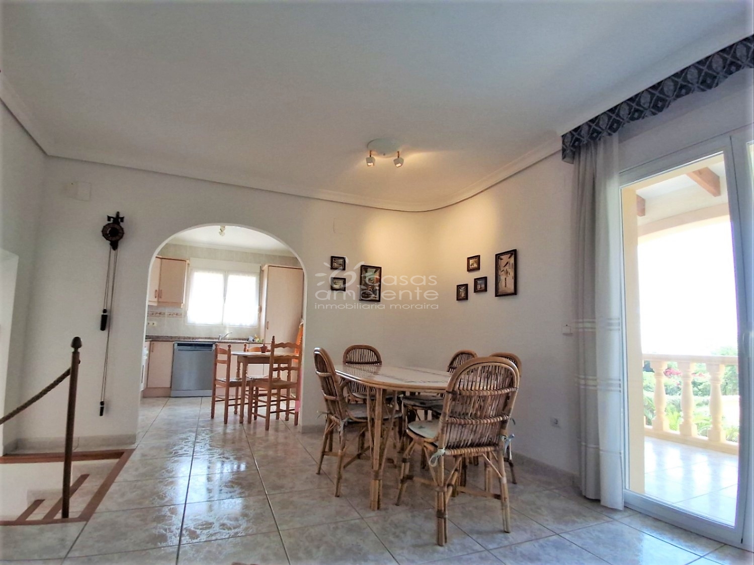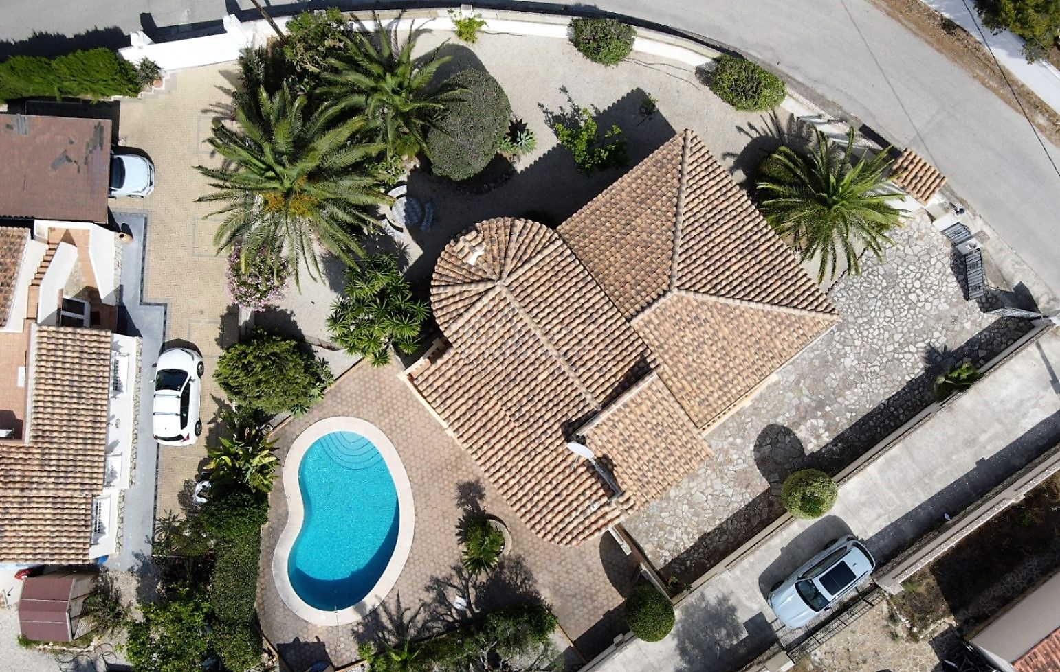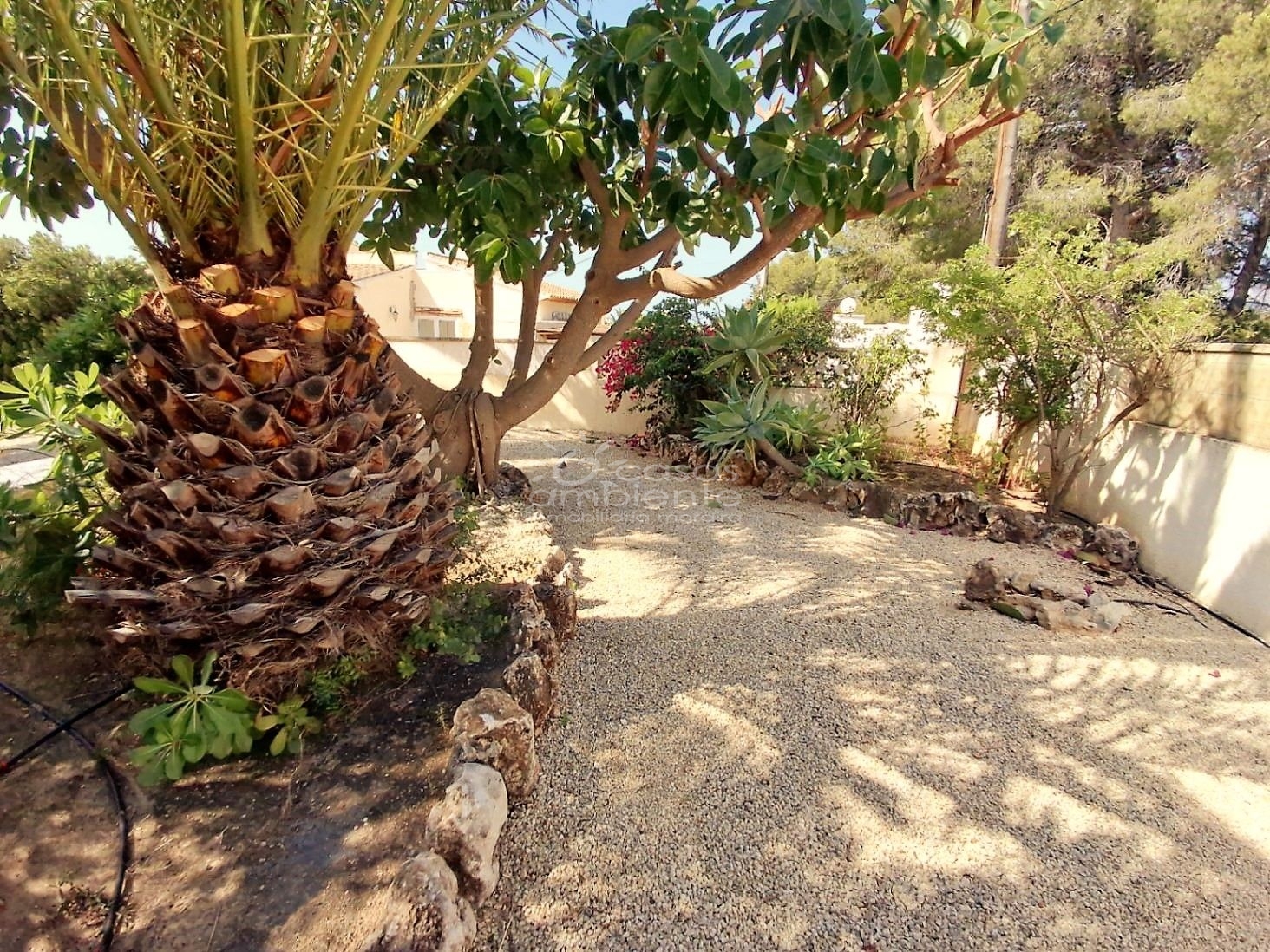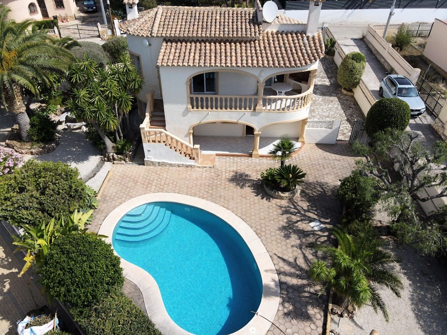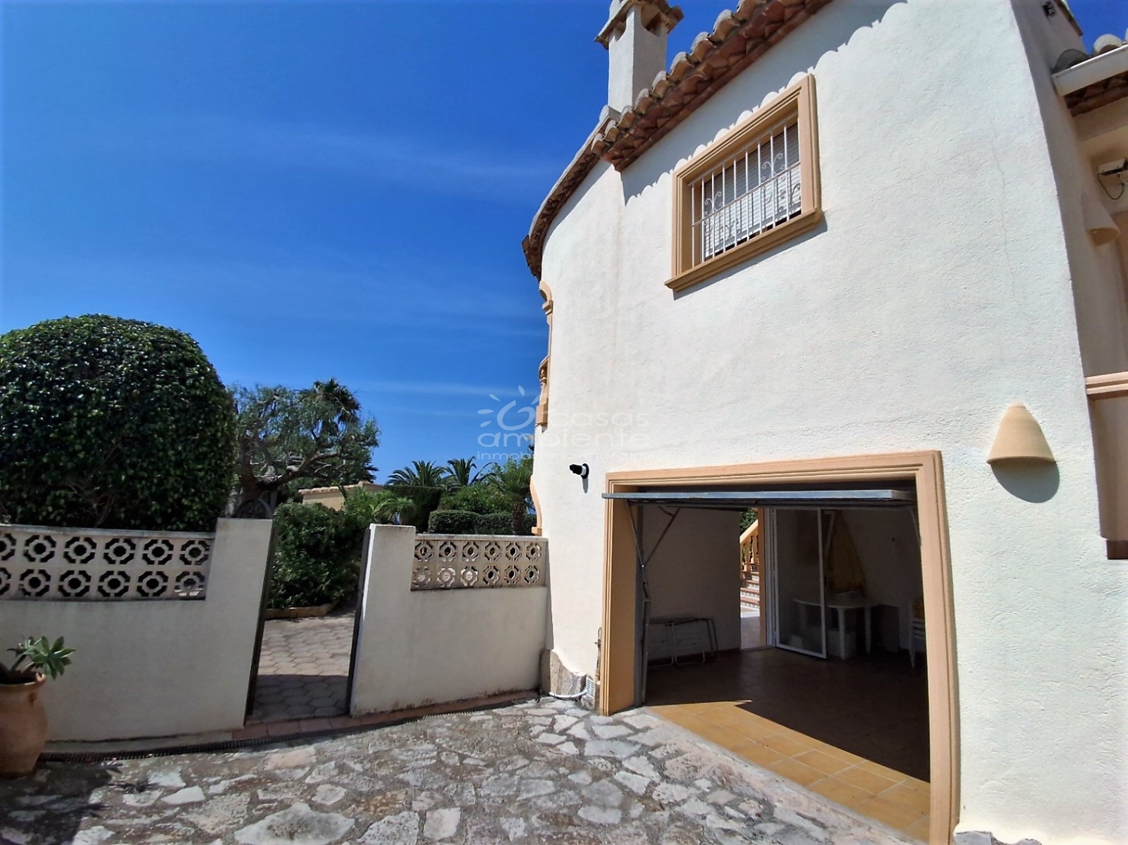 For sale: villa in Carrio Alto, Calpe. South-facing, with swimming pool, guest room, garage, and sea views. Close to the beach and amenities. This villa in Calpe is centrally located in the quiet neighborhood of Carrio Alto, less than a ten-minute drive from the center. La Fustera beach is only 1.8 kilometers away. The property is south-facing and located in an existing and quiet residential area. Description The house has two floors. On the upper floor is the main residence with a living and dining room that offers direct access to a covered terrace. There is a built-in barbecue here and from this veranda you have a view of the sea and the Peñon de Ifach. The living and dining room is open to the kitchen. A few steps down are two bedrooms that share a bathroom. On the ground floor is a separate guest room with its own bathroom. You will also find the garage here, which is also used as a laundry room and storage space. The house has double glazing, central heating, and a fireplace in the living room. The garden is mature and features a kidney-shaped swimming pool, outdoor shower, seating areas, and several terraces. Details South-facing villa in a quiet neighborhoodCentral locationGuest room with private bathroomGarage with extra space for laundry and storageCentral heating, fireplace, and double glazingPrivate swimming pool with outdoor shower and terracesBeautiful gardenWhy view this villa Good location close to the beach and amenitiesIn good condition and ready to move intoSpace for guests or familySea viewA lovely home in a great location. The property is in good condition and ready to move into. With some modernization, it could be turned into a comfortable contemporary home. Book a viewing today and discover the possibilities of this property. Would you like to view this villa? Make an appointment with one of our staff members.