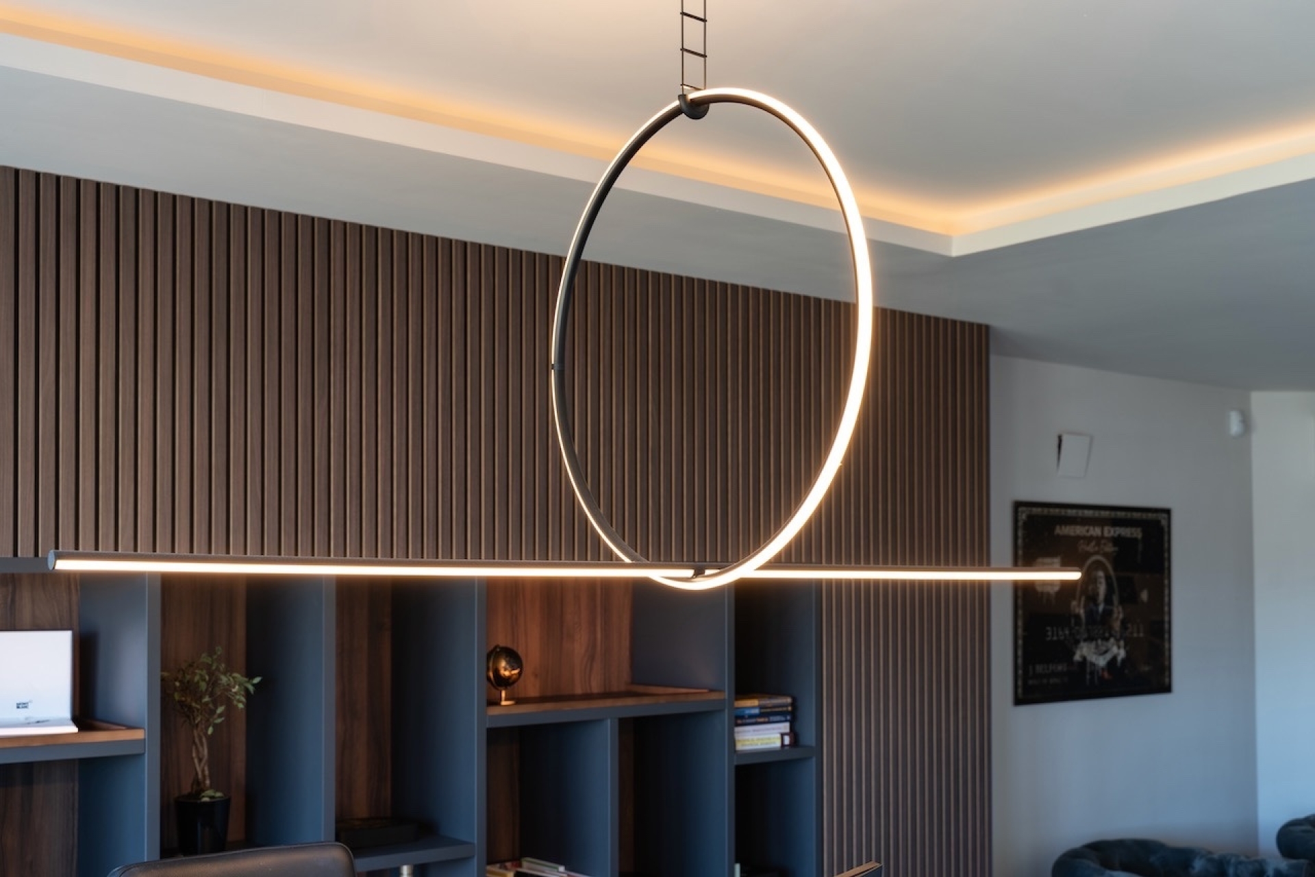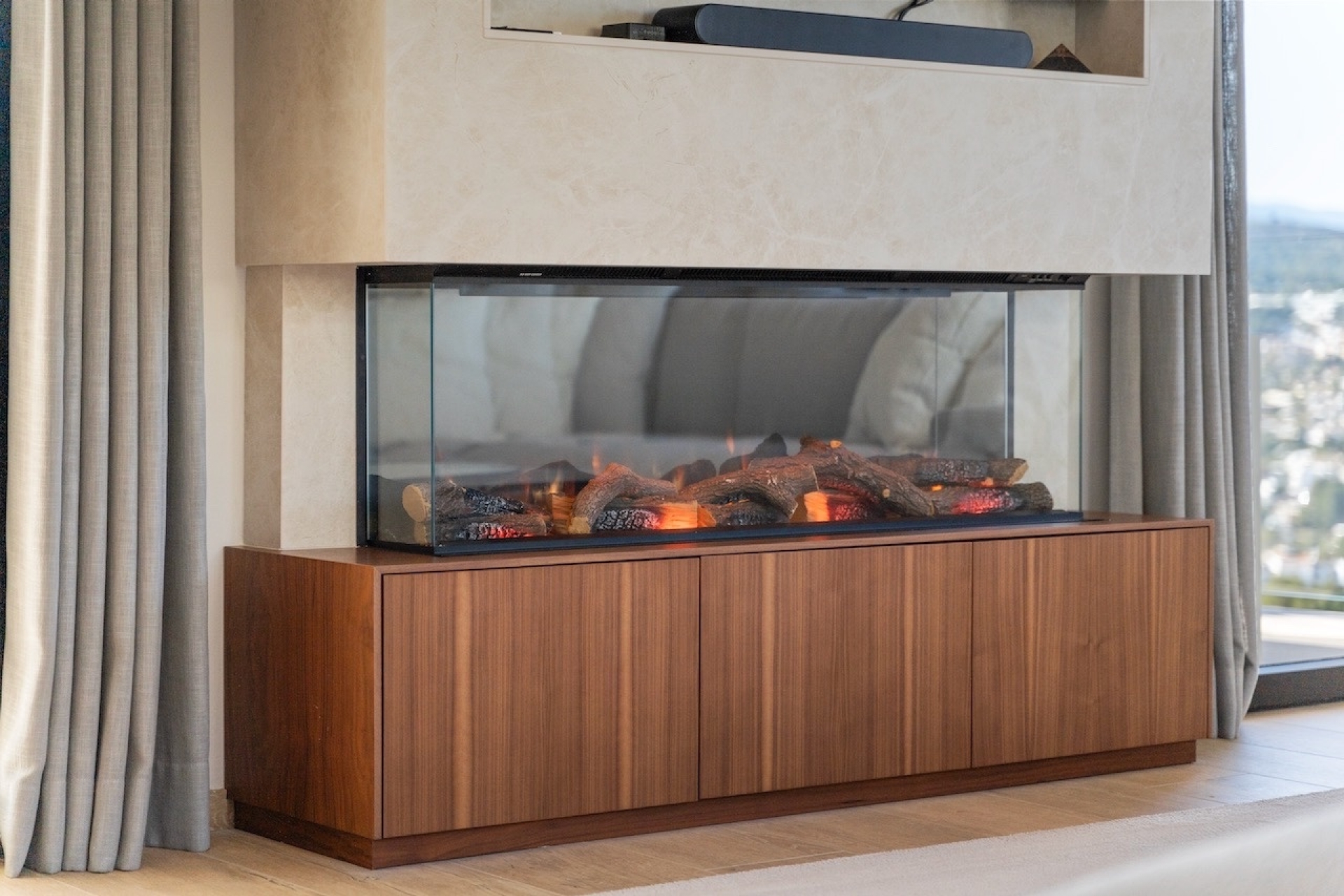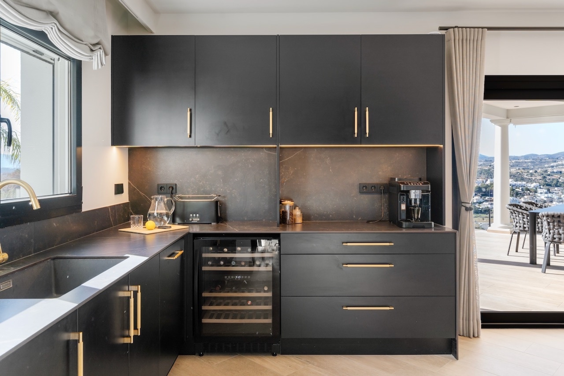 The villa welcomes you with a bright entrance hall leading into a stylish open-plan living space, where the kitchen, dining area and lounge flow seamlessly together. The kitchen features a breakfast bar, pantry and separate laundry room, while the living area is enhanced by an elegant electric fireplace. Large floor-to-ceiling windows open onto a spacious terrace with dining and chill-out areas, as well as a private pool, creating the perfect setting to enjoy the views and outdoor lifestyle.
