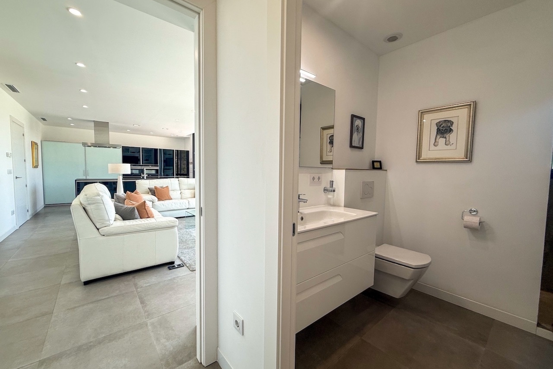 The villa offers three spacious double bedrooms, all with fitted wardrobes, and three beautifully appointed bathrooms with high-quality finishes, including walk-in showers and a poolside shower room. Every detail has been carefully considered, from extensive storage solutions and an internal garage with additional office or storage room, to the high specification throughout.